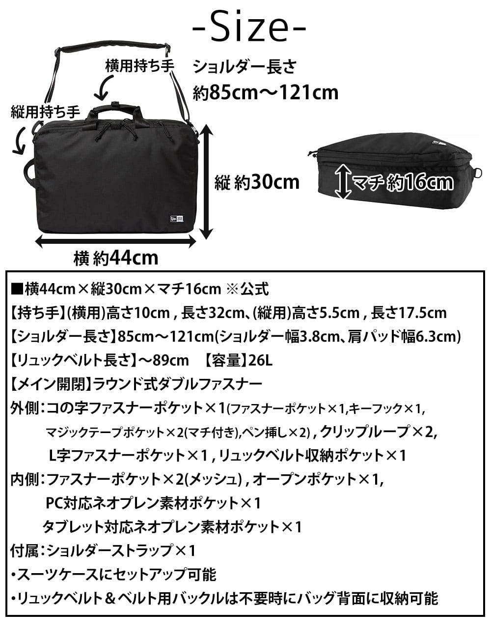 【ショルダーベルト長さ】85cm~121cm(ショルダー幅3.8cm、肩パッド幅6.3cm、取外し可)