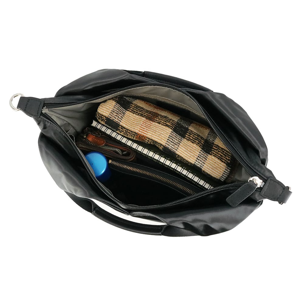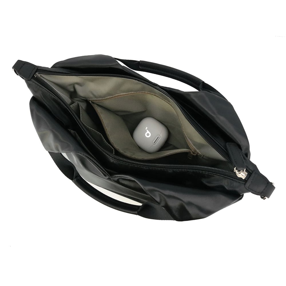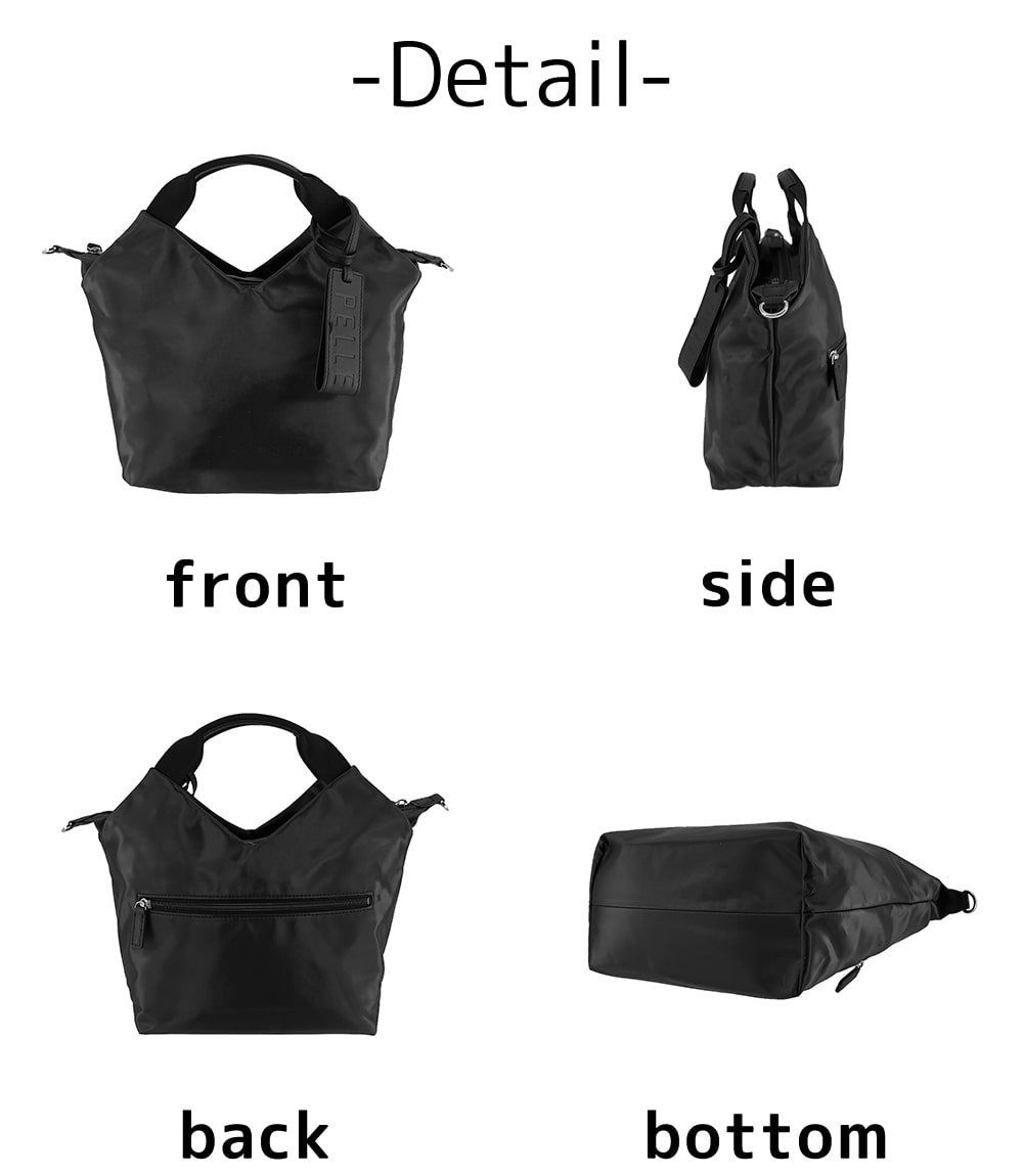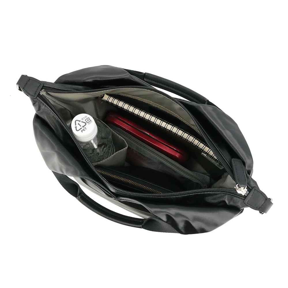 ボトルホルダーや抗菌防臭ポケットを備えた高スペックなハンドバッグ。