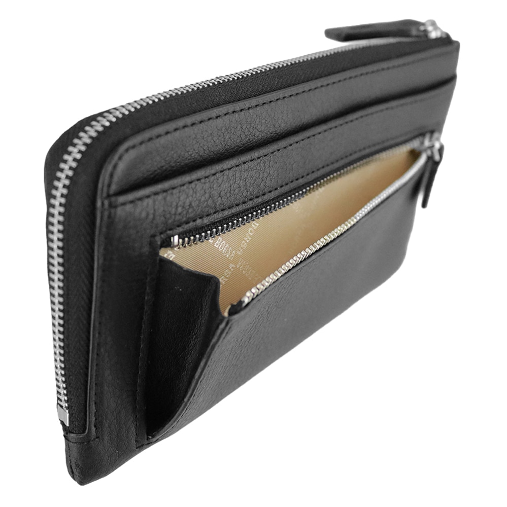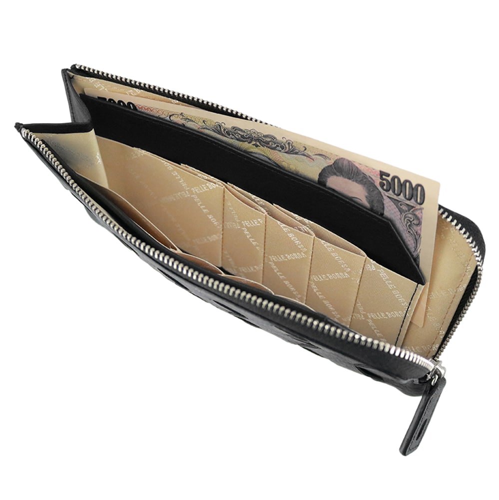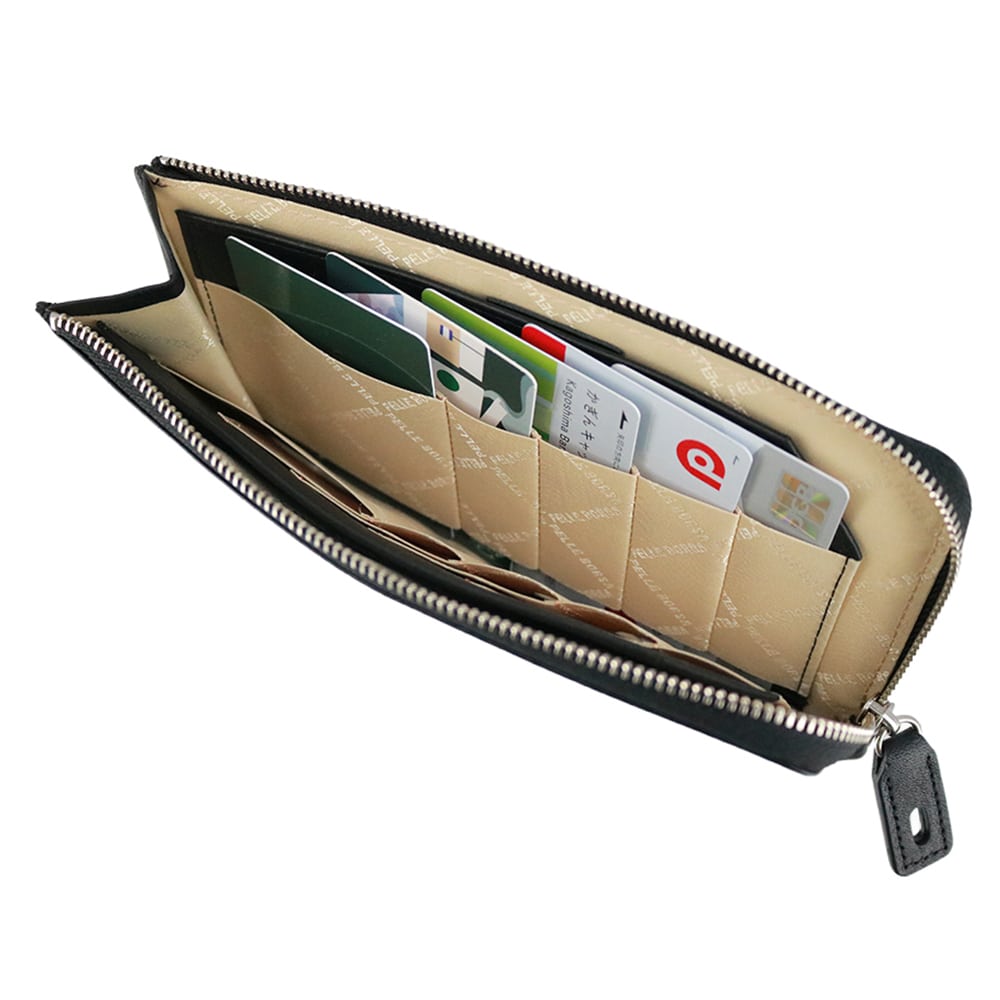 横幅を抑えたコンパクト設計ながら、通帳まで収まる収納力を備えたL字ファスナー長財布。