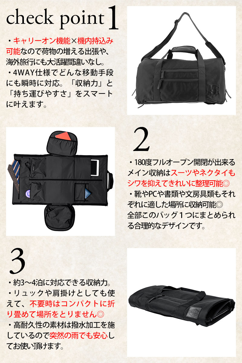 キーワード: 20代 30代 40代 50代 就職祝い 出張 機内持ち込み可能サイズ 仕事用 多機能 キャリーオン 黒 グレー 人気 トレンド 無地 カジュアル フォーマル 手提げバッグ ビジネスバッグ 大容量 40l 営業 IT 動きやすい 軽量 軽い 4WAY 3泊~4泊 プレゼント ギフト ラッピング ラッピング無料 メンズ レディース 男性 女性 通勤 通学 ビジネス 学生 ブランド ポイント消化 ニューバッグワカマツ ニューバックワカマツ