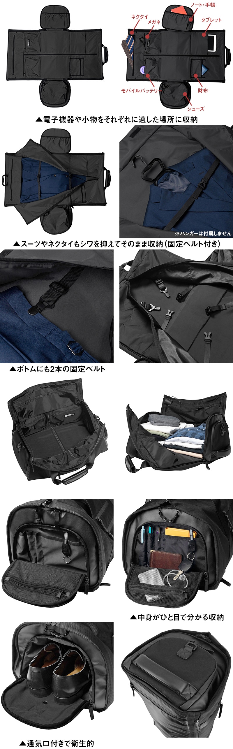 このバッグひとつでスーツ、ワイシャツ、靴、ネクタイ、折りたたみ傘などをまとめて収納できます。TRAVELLER PLUSからPC収納ポケットも追加され、出張などで更に活躍します◎