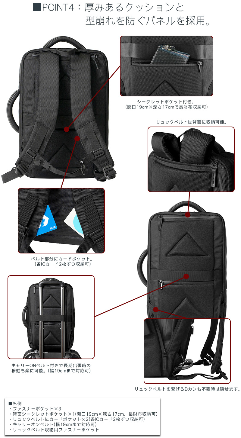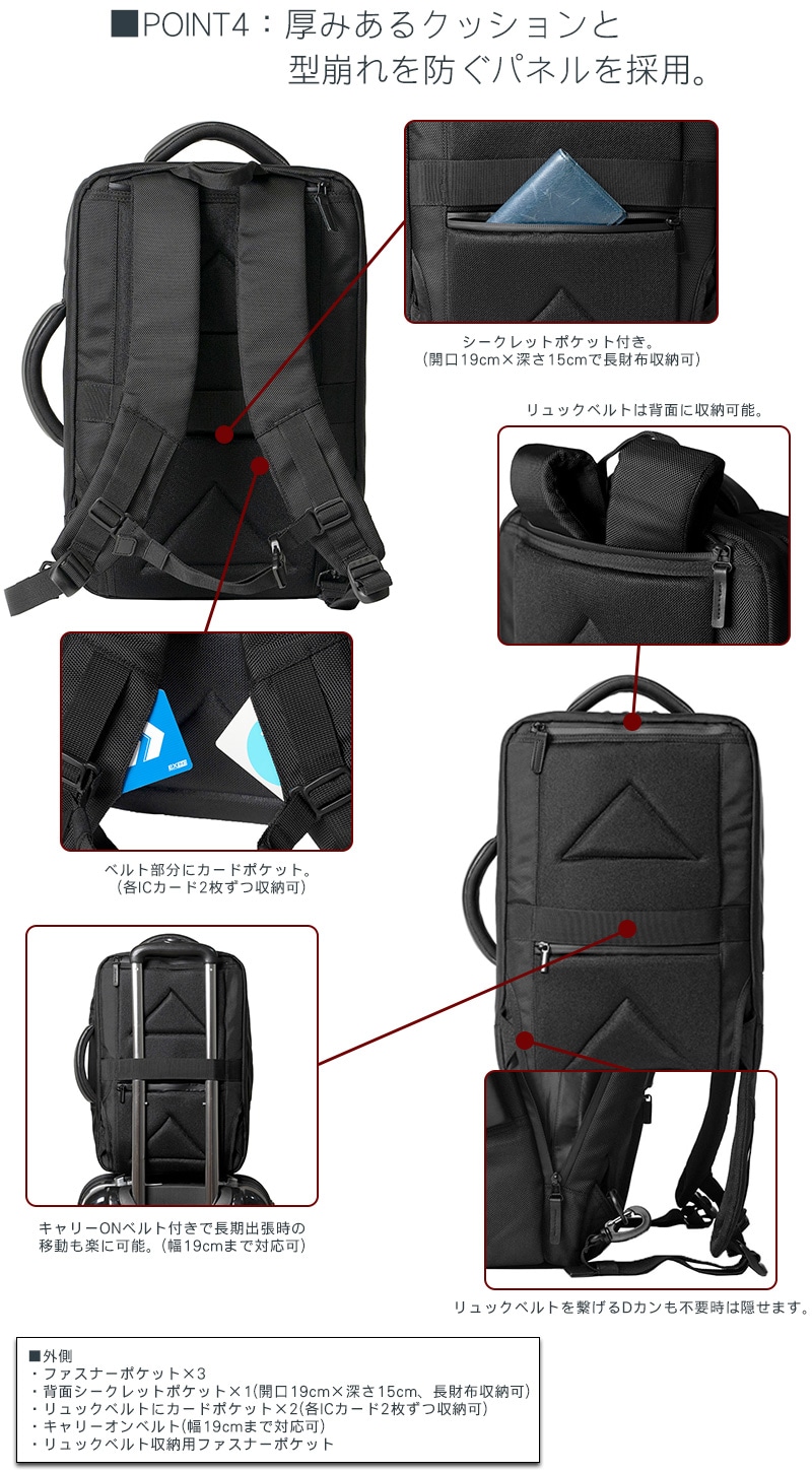 背面シークレットポケット×1(開口19cm×深さ15cm)