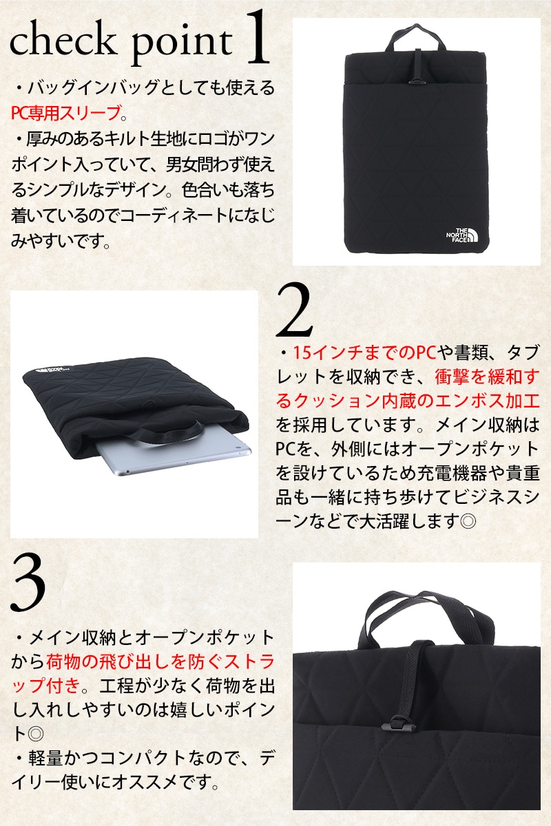 ザ・ノース・フェイス キルティング バッグインバッグ 15インチ PCバッグ 専用スリーブ 通勤 通学 おしゃれ かっこいい 軽い 旅行 綺麗め 上品 ビジネス 出張 Geoface PC Sleeve 15