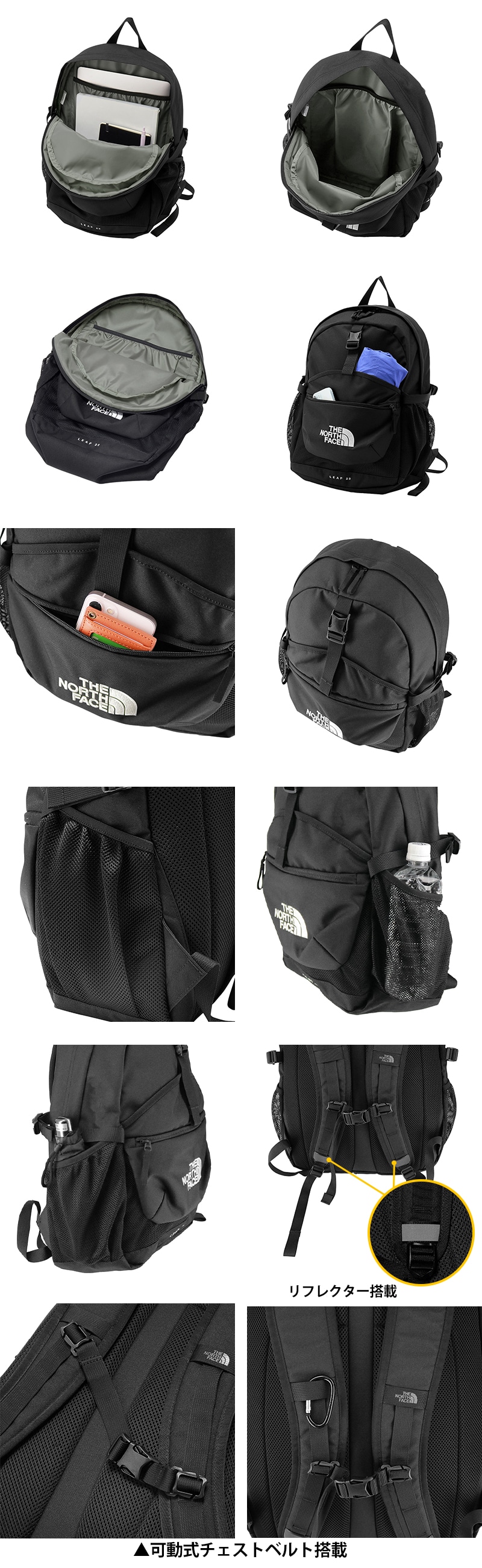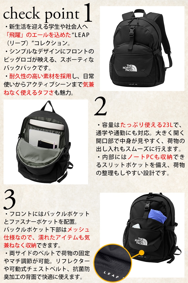 | 備考 | 【メイン開閉】ダブルファスナー 外側/ バックルポケット×1 ファスナーポケット×1 メッシュオープンポケット×2 内側/ オープンポケット×1 ・フロントのバックルポケット下部はメッシュ仕様 ・荷物の固定やマチ調節に便利なベルトを両サイドに搭載 ・リュックベルトにリフレクター搭載 ・可動式チェストベルト搭載 キーワード : 通学リュック 通勤リュック 旅行バッグ デイリーユース タウンユース 街歩き 軽量 丈夫 高校生 大学生 街歩き用 アウトドア 1万円台 小さめ ノートPC収納 ポケット多数 抗菌防臭 A4 メンズ レディース THE NORTH FACE ノースフェイス リープ20 23L 20リットル 黒 ブラック ネイビー カジュアル おしゃれ シンプル プレゼント ギフト ラッピング ラッピング無料 男性 女性 ビジネス 学生 ブランド ポイント消化 ニューバッグワカマツ ニューバックワカマツ | ||