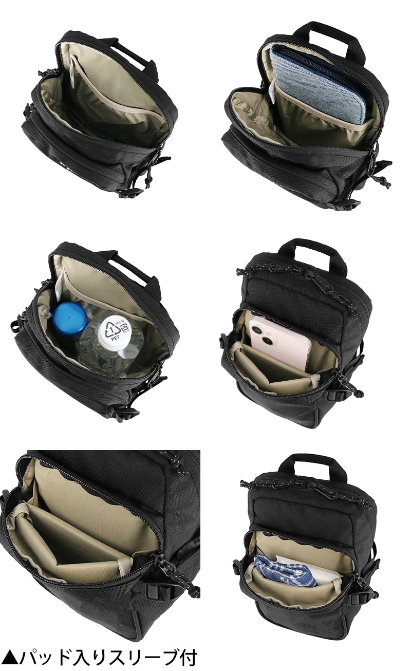 フロントにはパッド入りのスリーブを配置し、ガジェットの収納が可能。