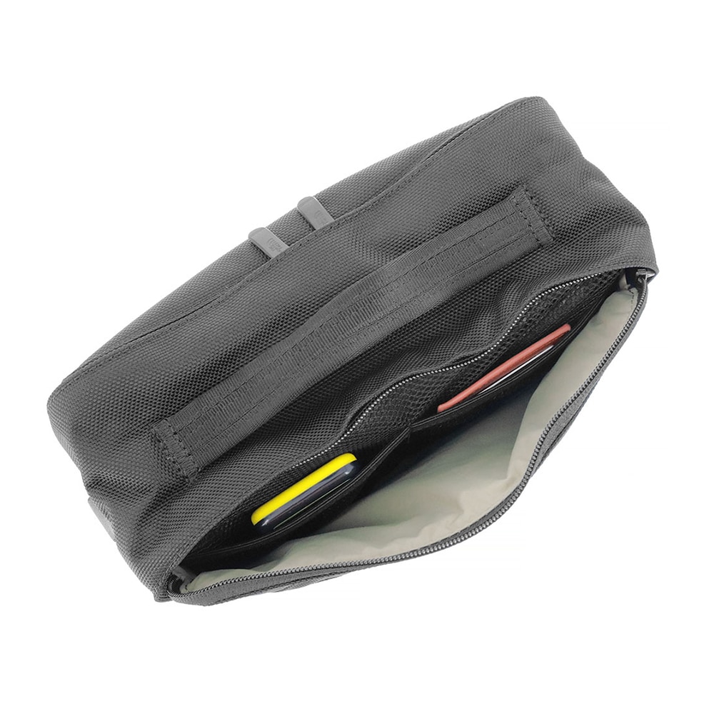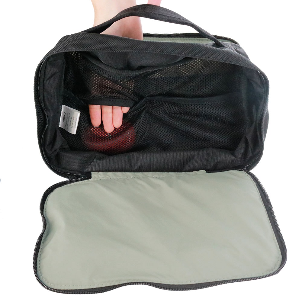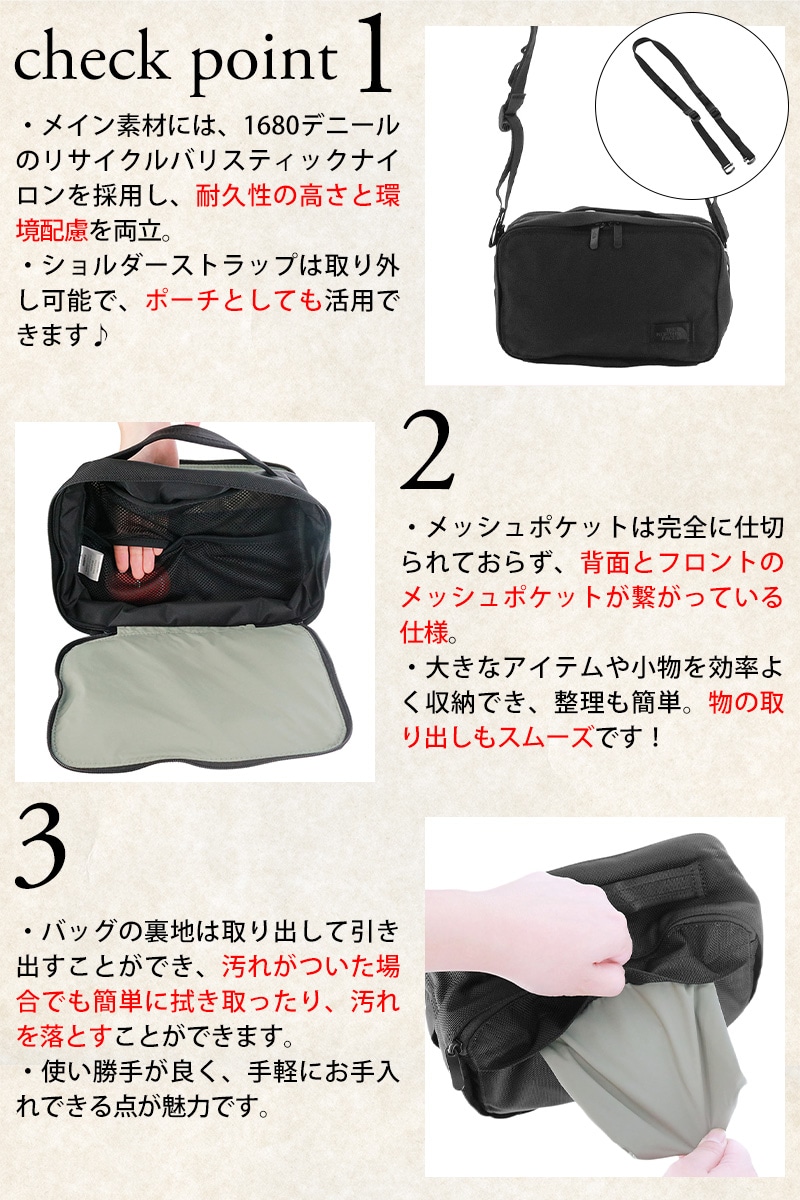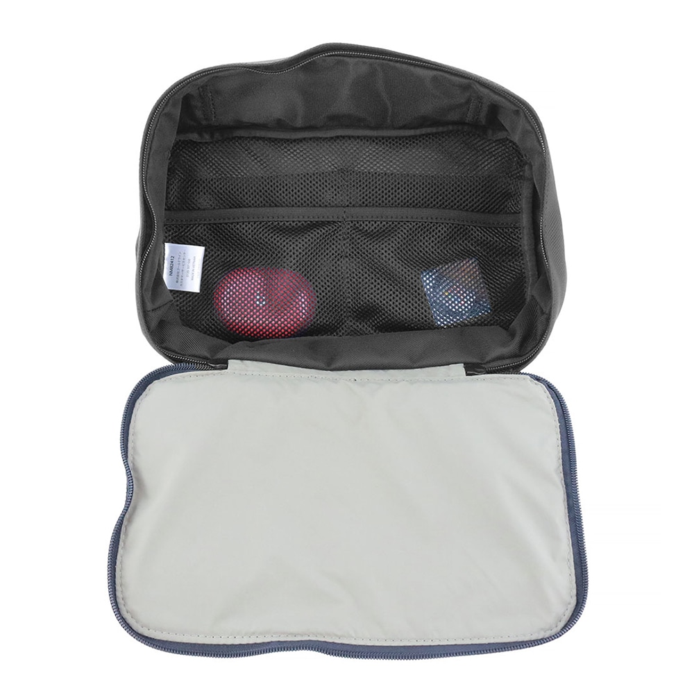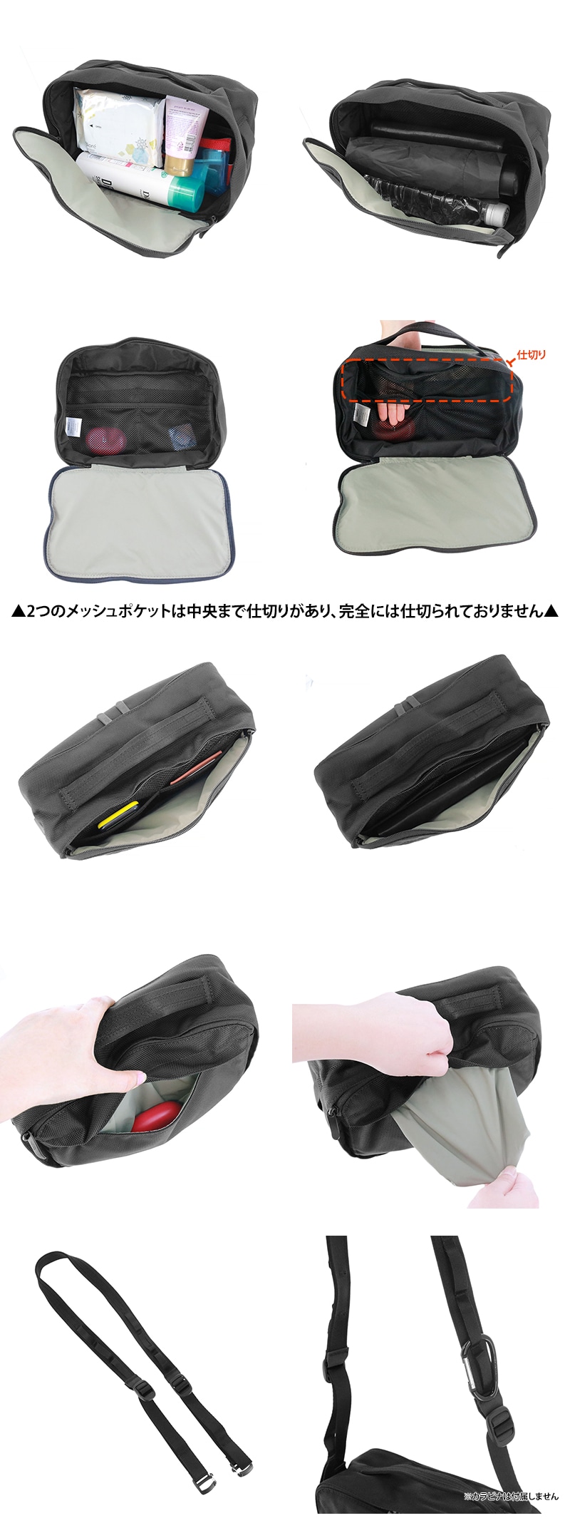 ショルダーベルトを外してパッキングポーチとしても使える2WAY仕様!前面側、背面側どちらからもアクセス出来る構造で、内部はメッシュポケットで仕切られています。(完全に仕切られているわけではありません)サッと持ち運びする際も便利な、ハンドルをバッグトップに設けています。