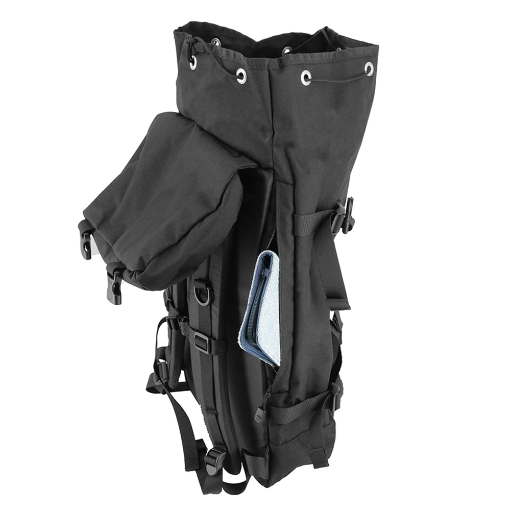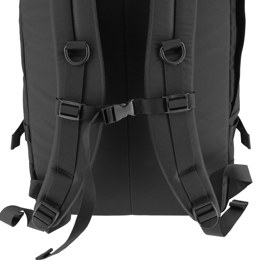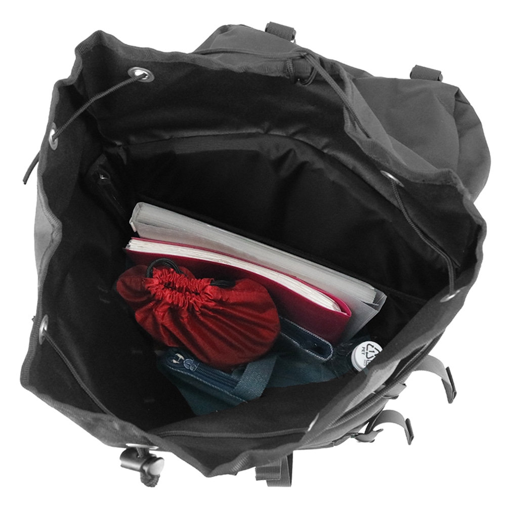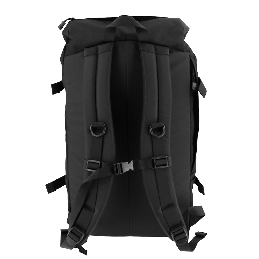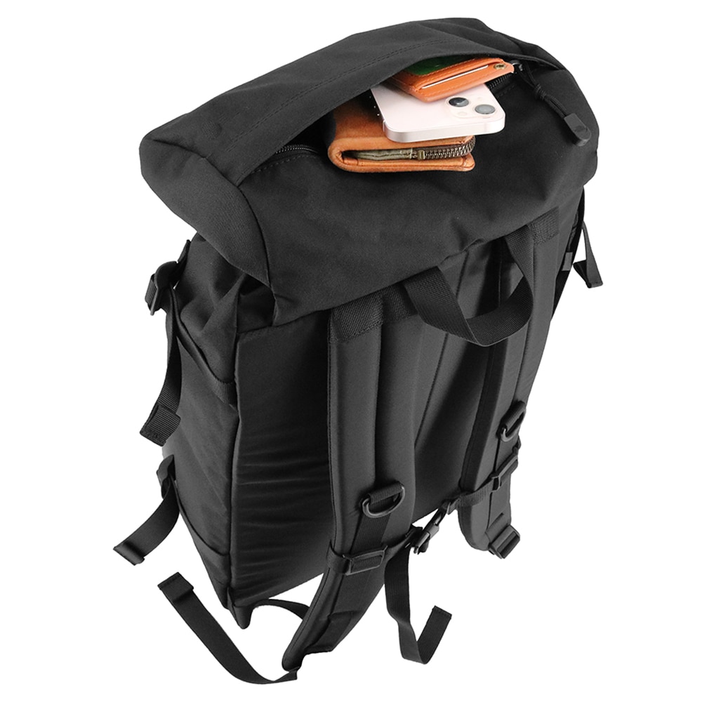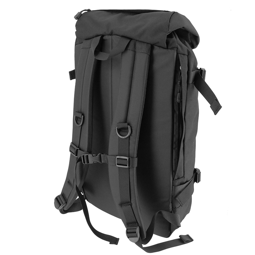 バックルとドローコード、2種類の開閉方法を採用したロールトップ風デザインのバックパック。