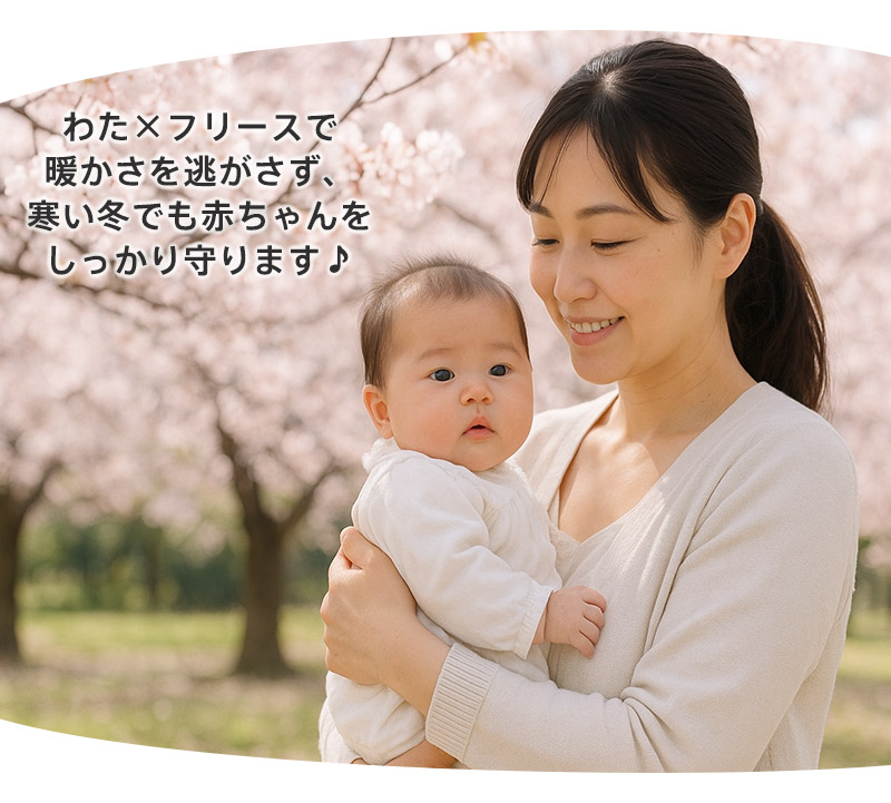 表地には軽量で柔らかいマイクロフリース素材を採用し、肌触りの良い素材でお子様を包み込みます。