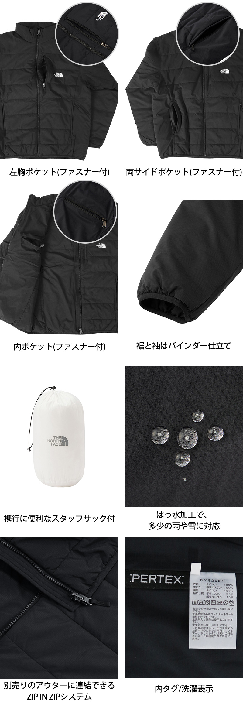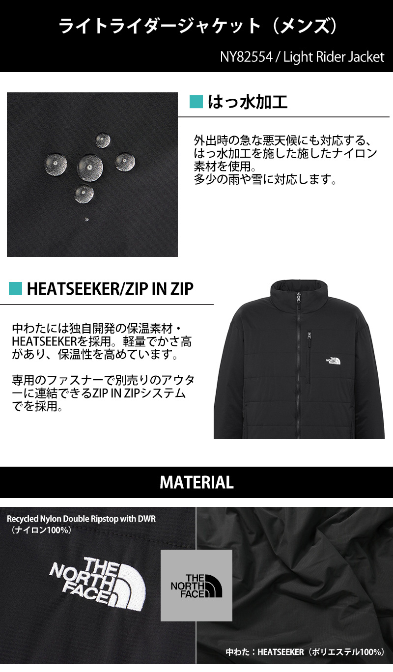 軽量で強度のあるリップストップナイロンにはっ水加工を施す事で、多少の雪や雨程度ならしっかり弾く頼もしい仕上がりに。 また、THE NORTH FACEが独自に開発した保温素材「HEATSEEKER(ヒートシーカー)」(ポリエステル100%)を中わたに使用。 繊維の間に空気をたっぷり含む事で、少ない量でもしっかり暖かくダウンのように軽いのが特徴。 さらに、濡れても保温力が落ちにくい為、街中はもちろんアウトドアや旅先でも快適!