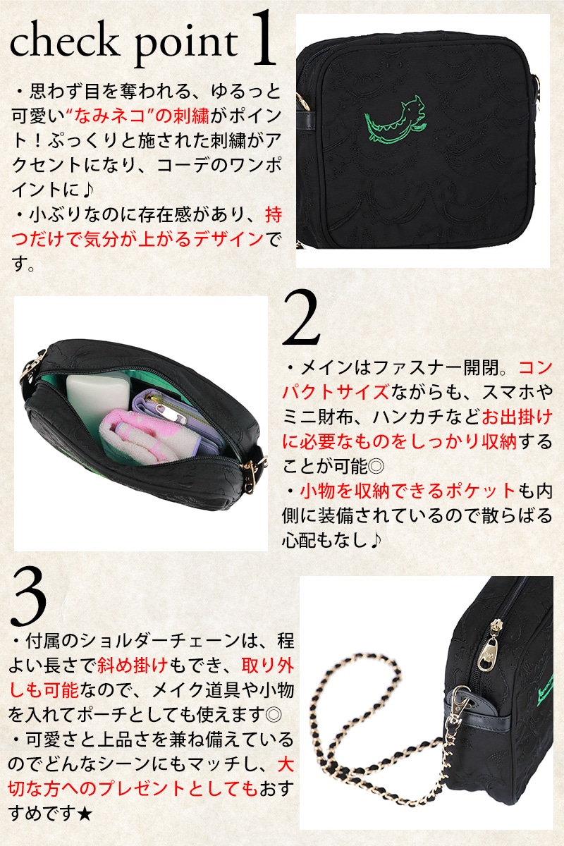 さり気ないネコモチーフがコーデのアクセントになる、遊び心と上品さを併せ持ったショルダーバッグ。