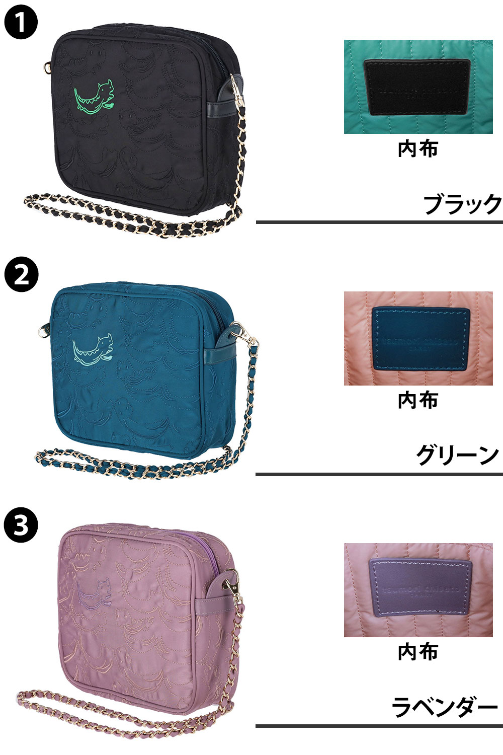 ボディ全体に施された刺繍は、波に乗るネコたちの動きを感じさせる繊細な仕上がり。