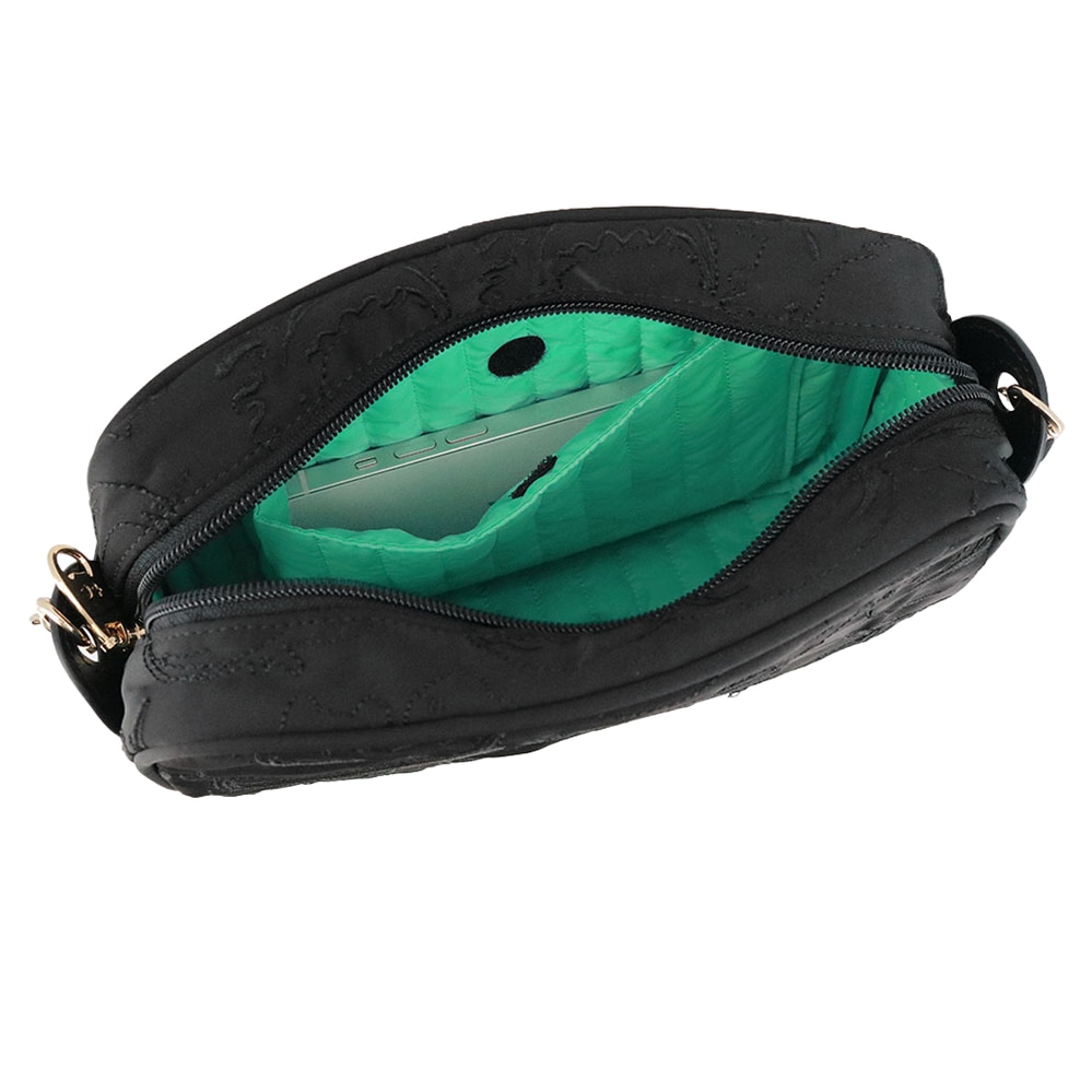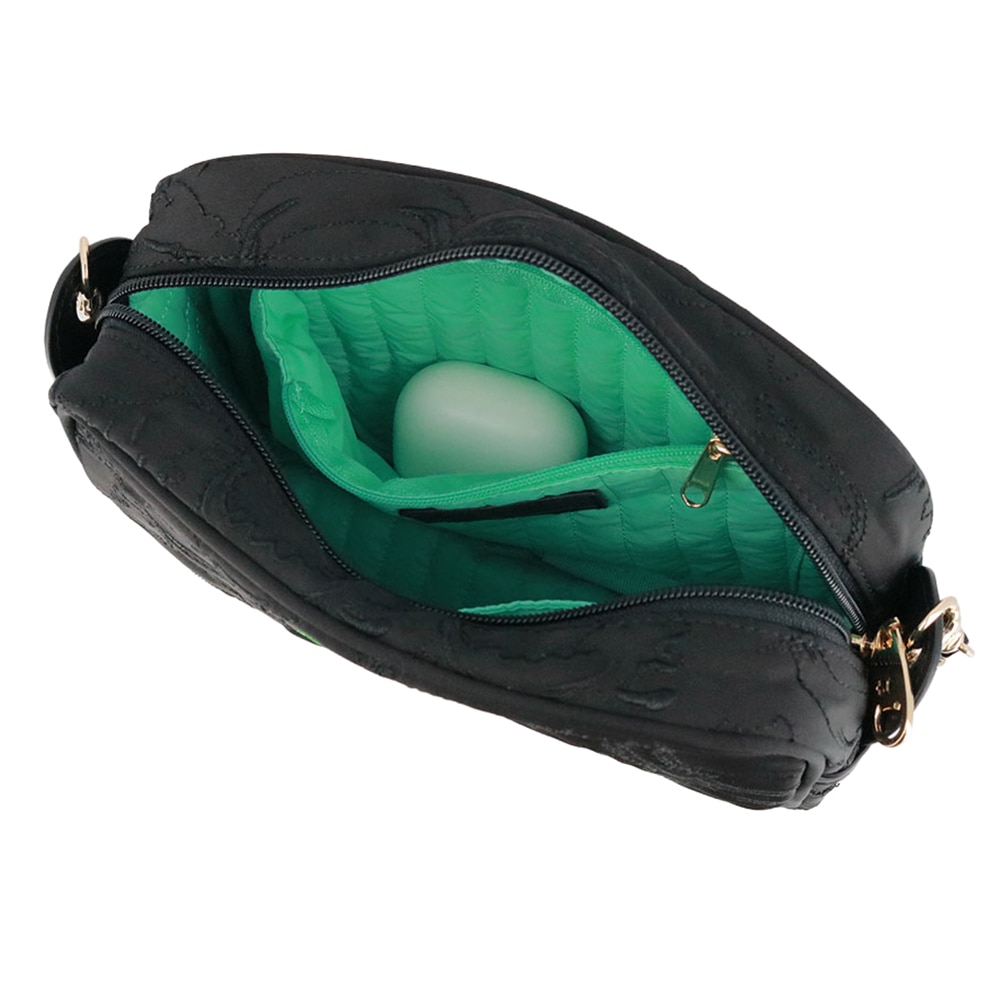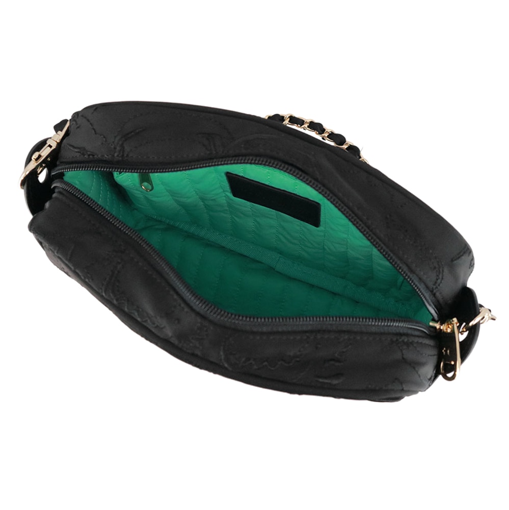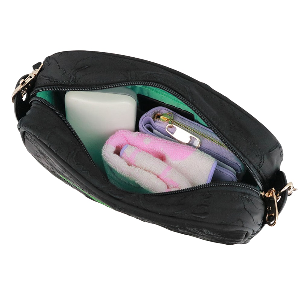 外ポケットを設けず刺繍の世界観をしっかり楽しめる一方、内側には片マチ付きのポケットを備え、見た目以上に使いやすい設計に。