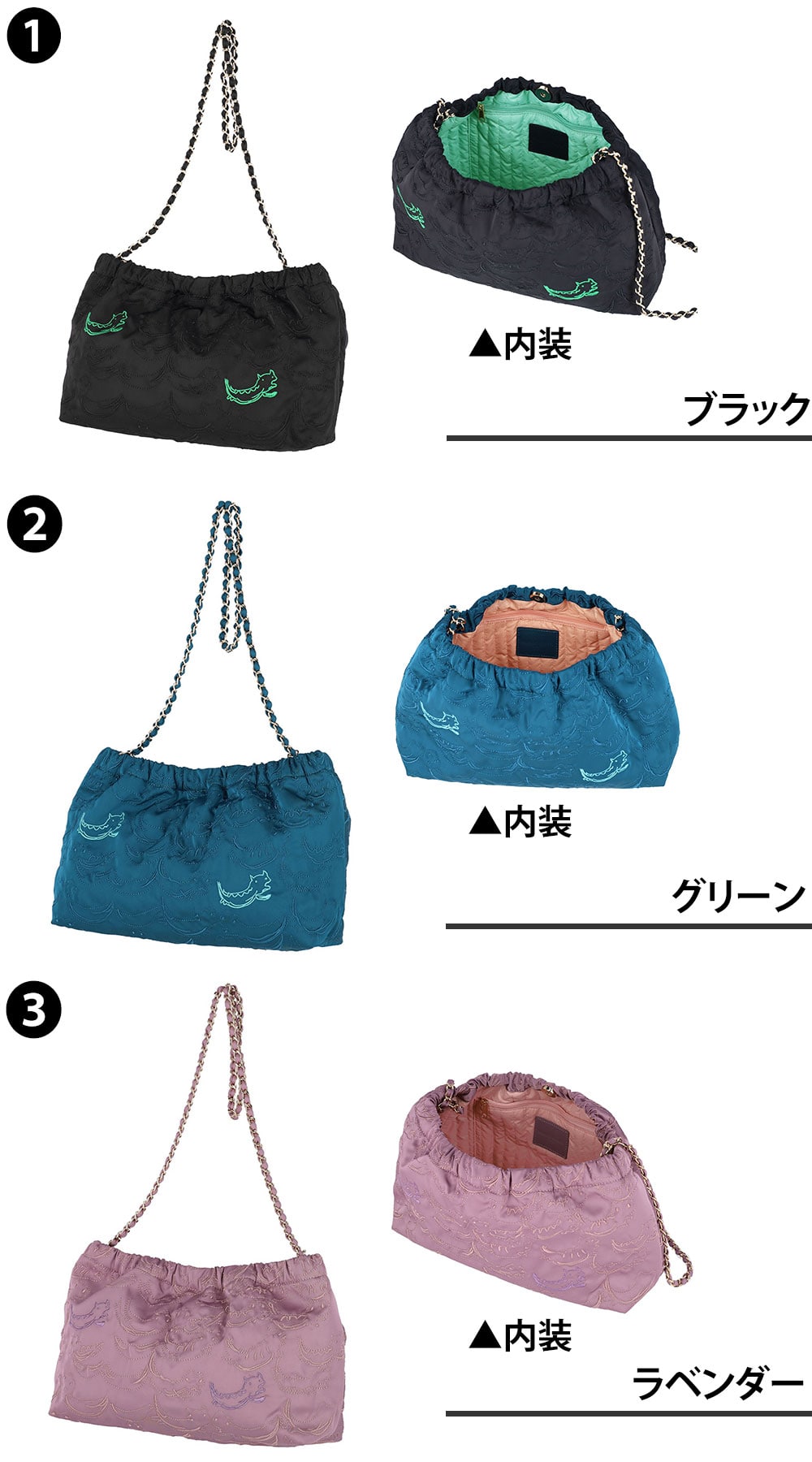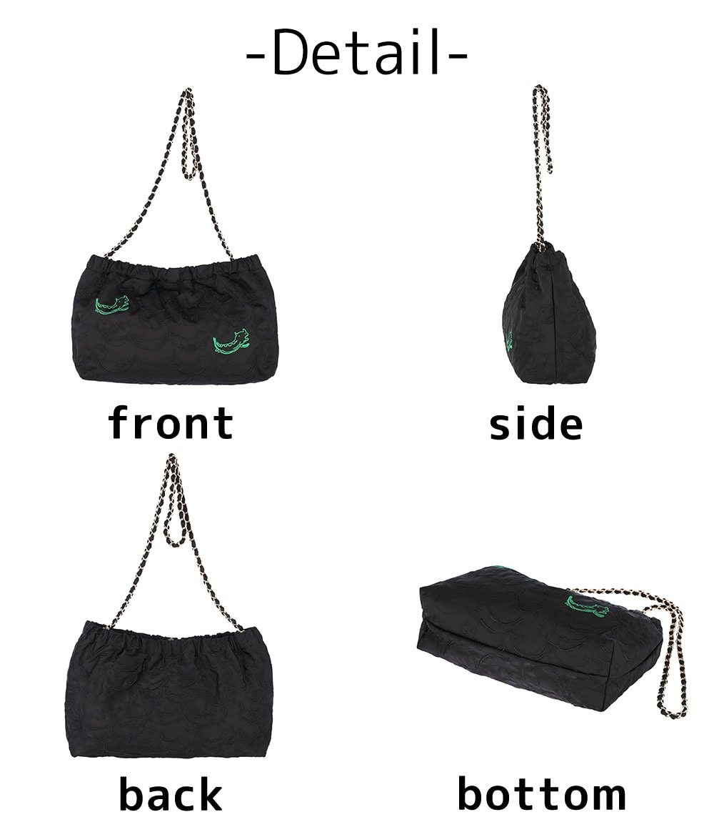 開口部にギャザーを寄せた横型デザインで、刺繍の可愛らしさにやわらかな表情をプラス。