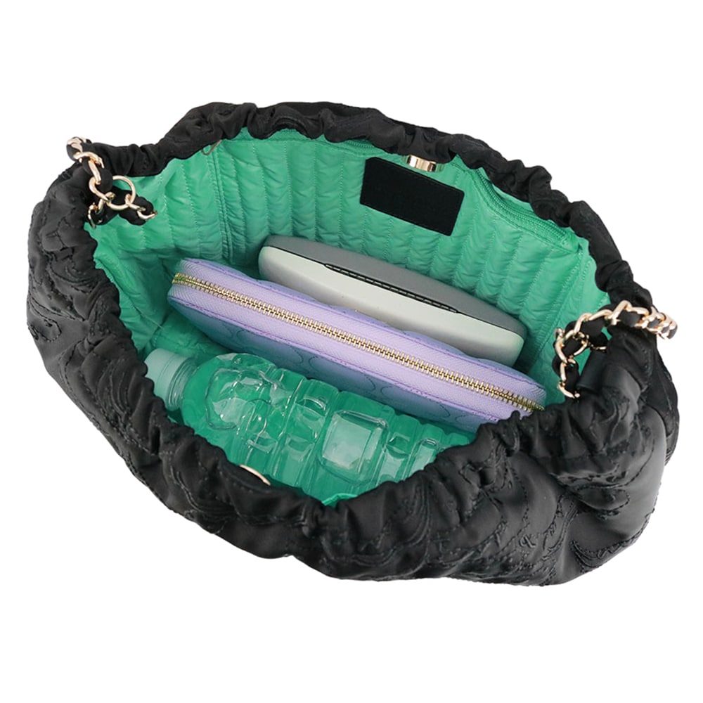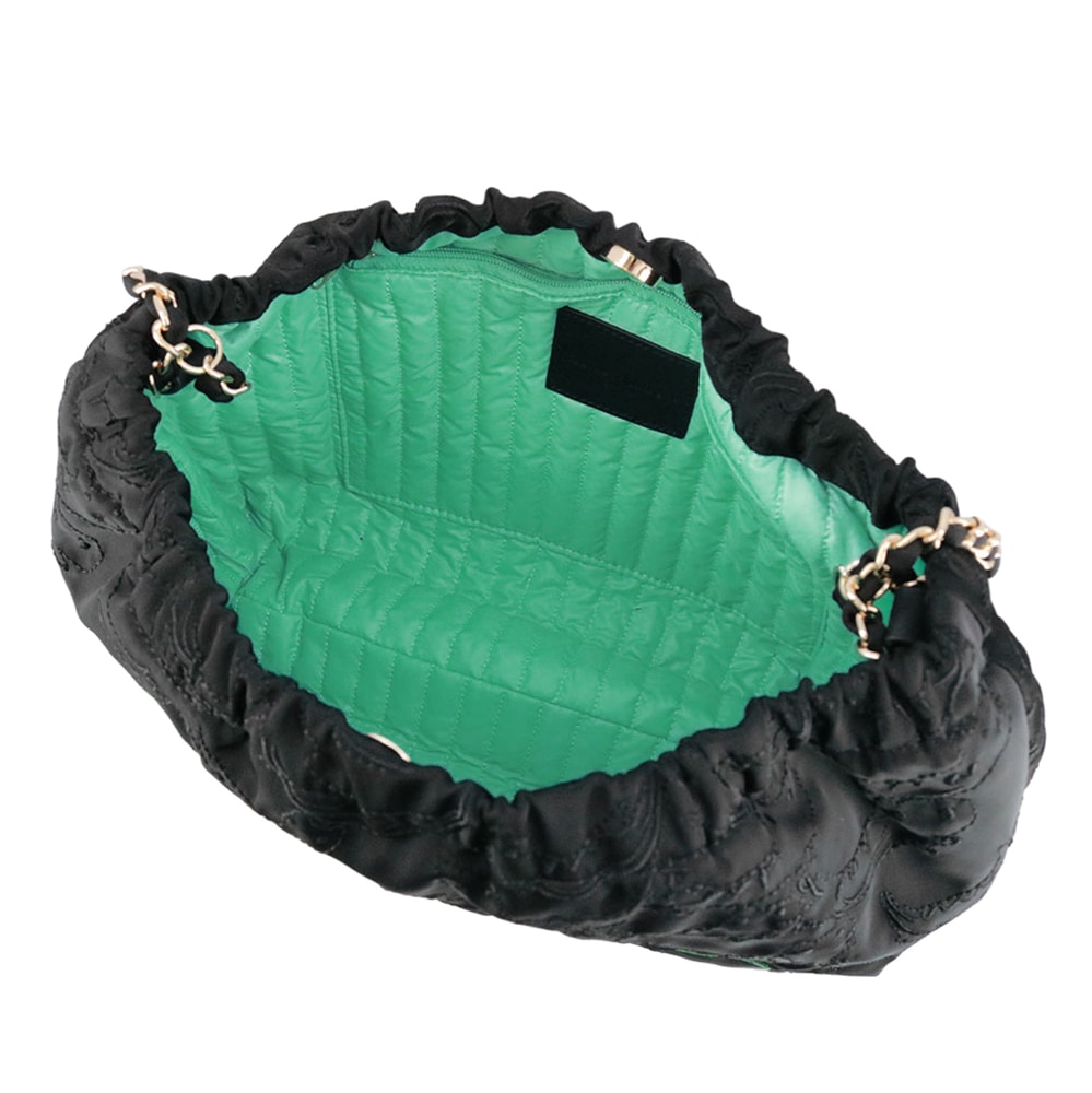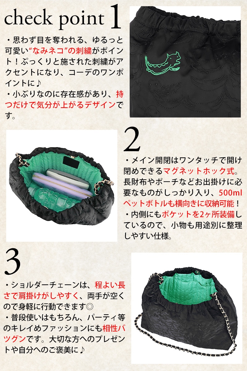 さり気ないネコモチーフがコーデのアクセントになる、遊び心と上品さを併せ持ったショルダーバッグ。