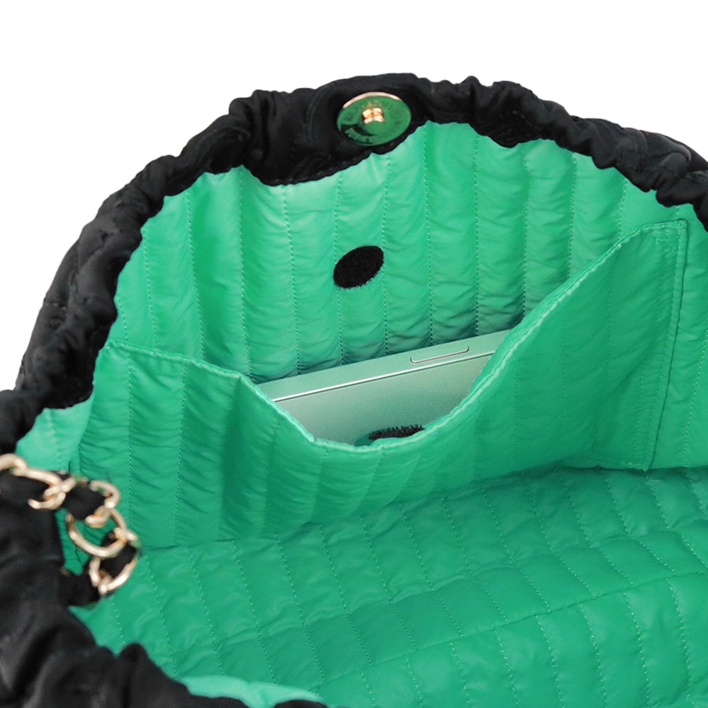 ボディと同色の布地を組み合わせたチェーンショルダーにゴールド金具を合わせ、カジュアルな中にも上品さをプラス♪