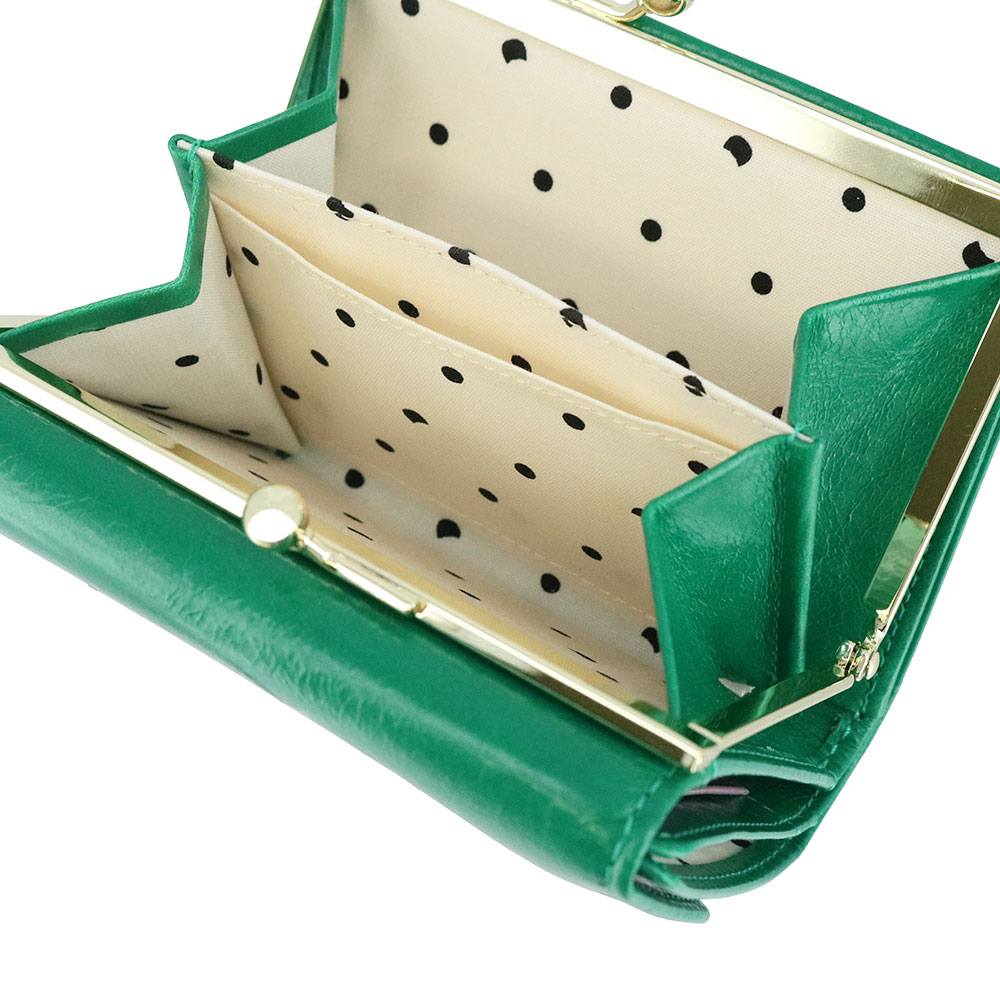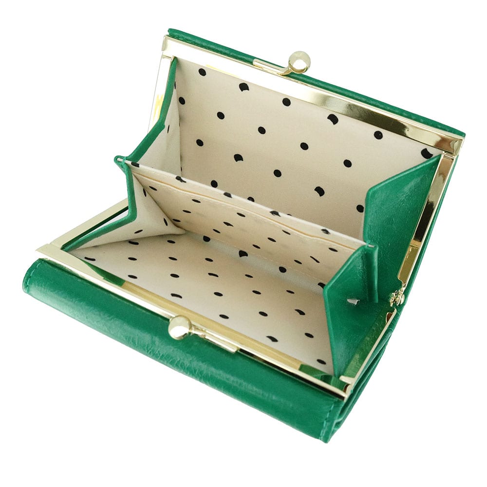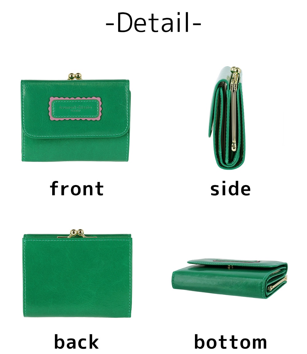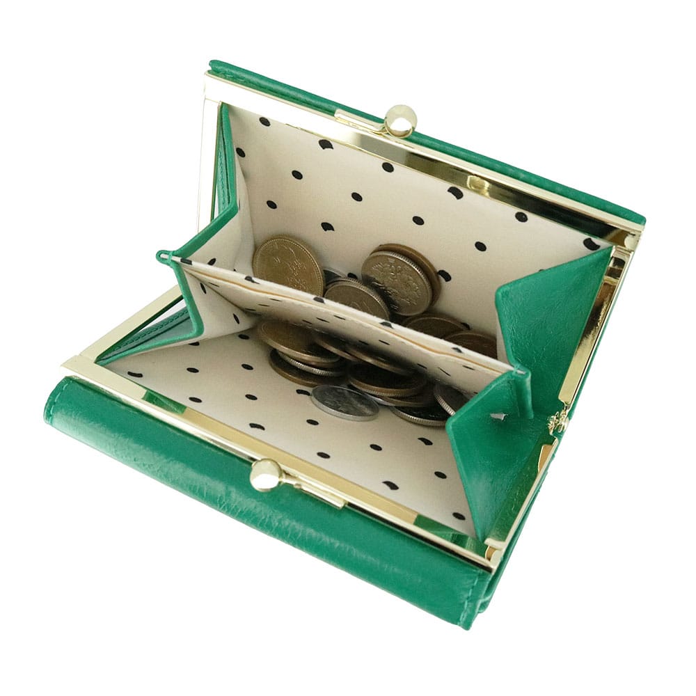 女性に人気のがま口デザインの小銭入れを採用。ゴールドカラーの金具で、より高級感を高めています。