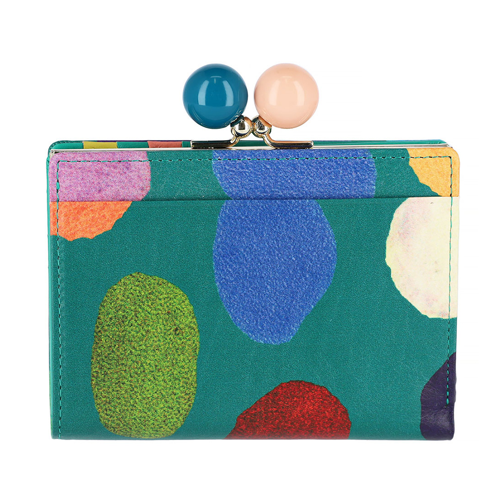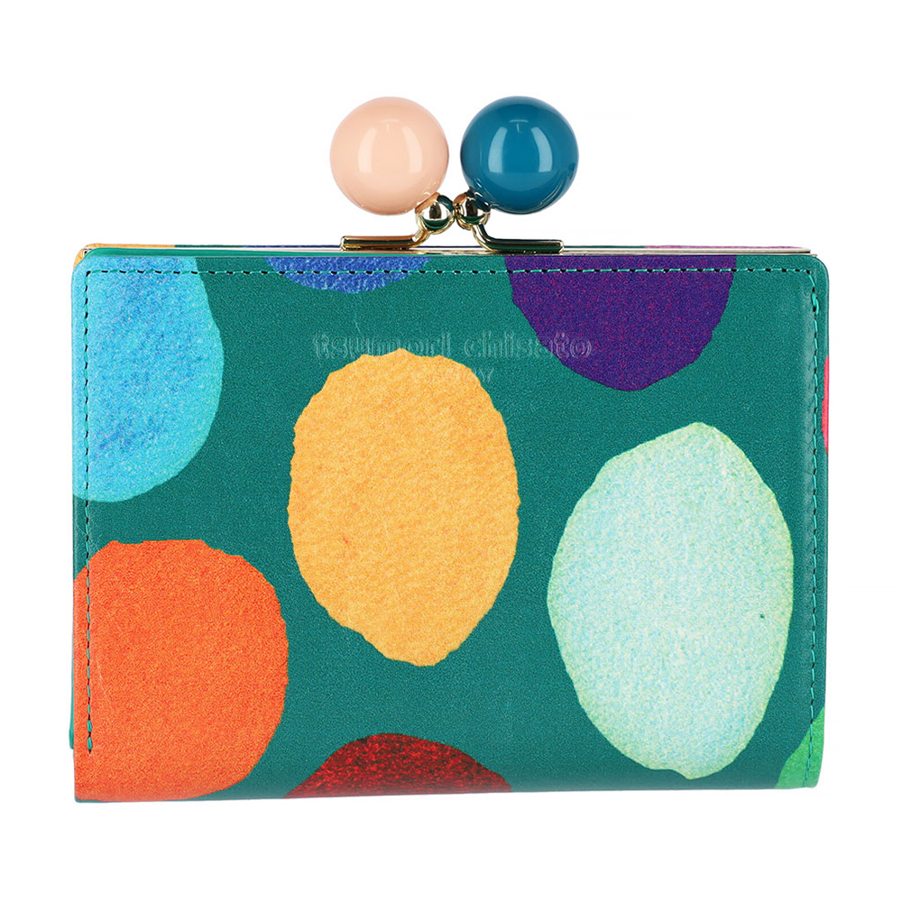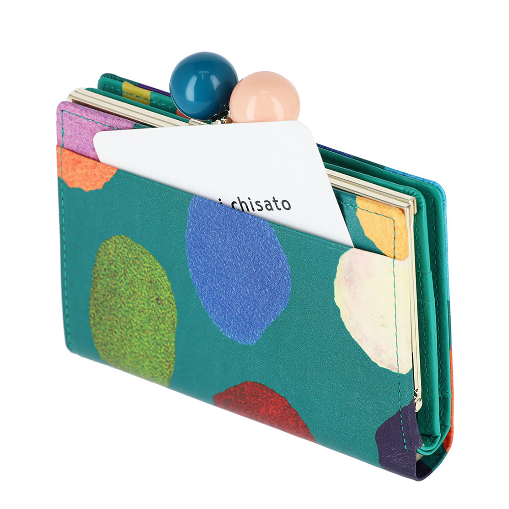 四角いスクエアボディにコロンと可愛いがま玉を添えたアートチックな二つ折り財布。