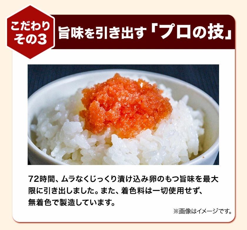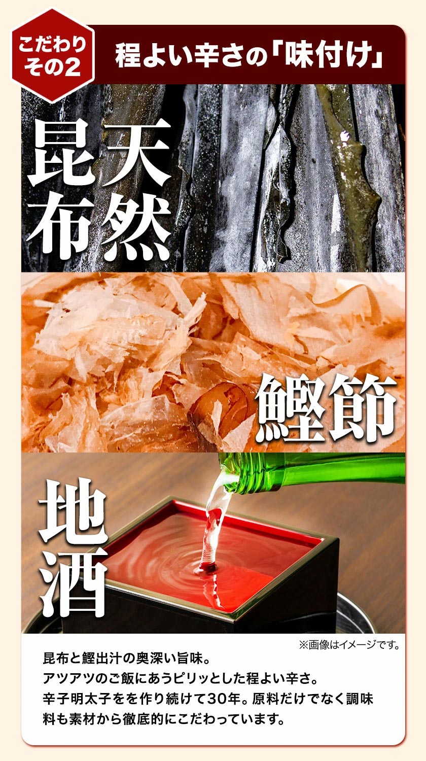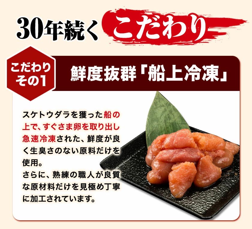 スケトウダラの卵巣(米国産)、食塩、米発酵調味料、還元水飴、清酒、唐辛子、鰹節、昆布/調味料(アミノ酸等)、酒精、酸化防止剤(ビタミンC)、香辛料、甘味料(甘草、ステビア)、酸素、発色剤(亜硝酸Na)、(一部に大豆を含む)