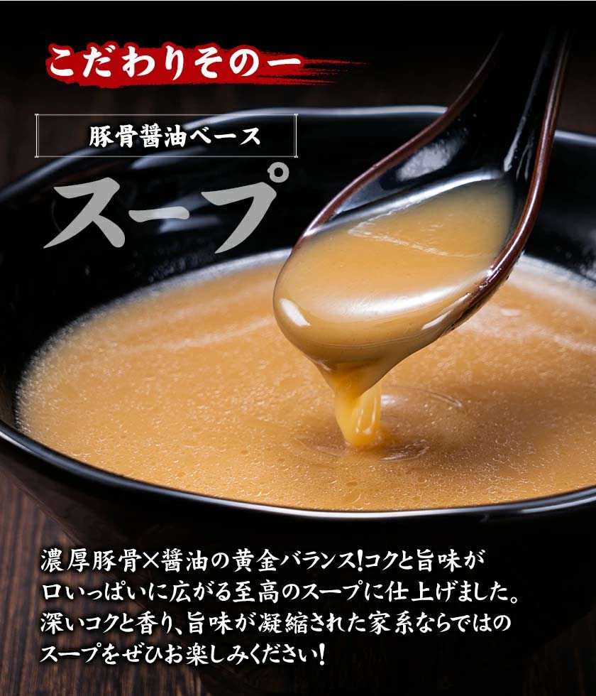 スープ:しょうゆ (国内製造)、ポークエキス、 動物油脂、食塩、砂糖、たん白加水分解物、酵母エキス、香辛料/調味料(アミノ酸 等)、酒精、カラメル色素、増粘剤(キサンタンガム)、酸味料、酸化防止剤(ビタミンE、ローズマリー抽出物)、(一部に 小麦・大豆・鶏肉・豚肉・ゼラチンを含む)