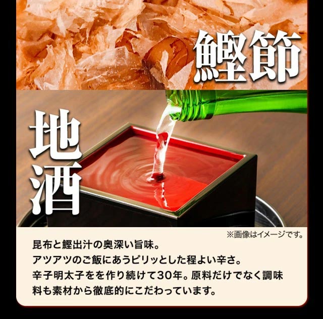 スケトウダラの卵巣(米国産)、食塩、米発酵調味料、還元水飴、清酒、唐辛子、鰹節、昆布/調味料(アミノ酸等)、酒精、酸化防止剤(ビタミンC)、香辛料、甘味料(甘草、ステビア)、酸素、発色剤(亜硝酸Na)、(一部に大豆を含む)
