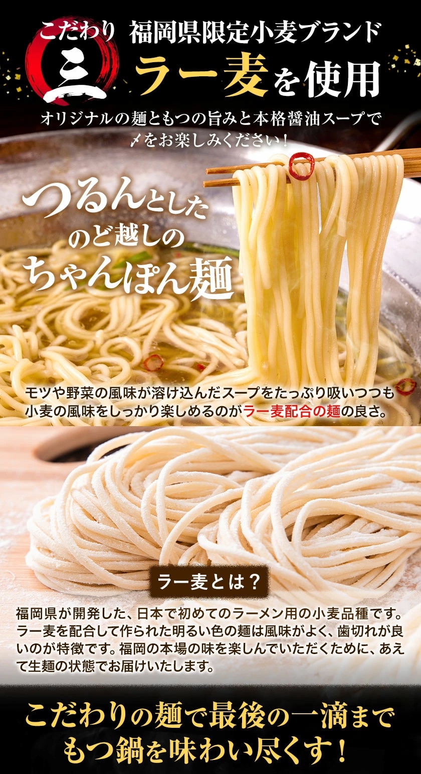 モツ:小腸(国産牛)麺:小麦粉(国内製造)、小麦たん白、食塩/酒精、かん水、具Ca、クチナシ色素、加工でん粉 スープ:醤油(国内製造)、アミノ酸液、食塩、魚介エキス/調味料(アミノ酸等)、甘味料(ステビア、甘草)、保存料(パラオキシ安息香酸)、(一部に大豆・小麦・さばを含む)