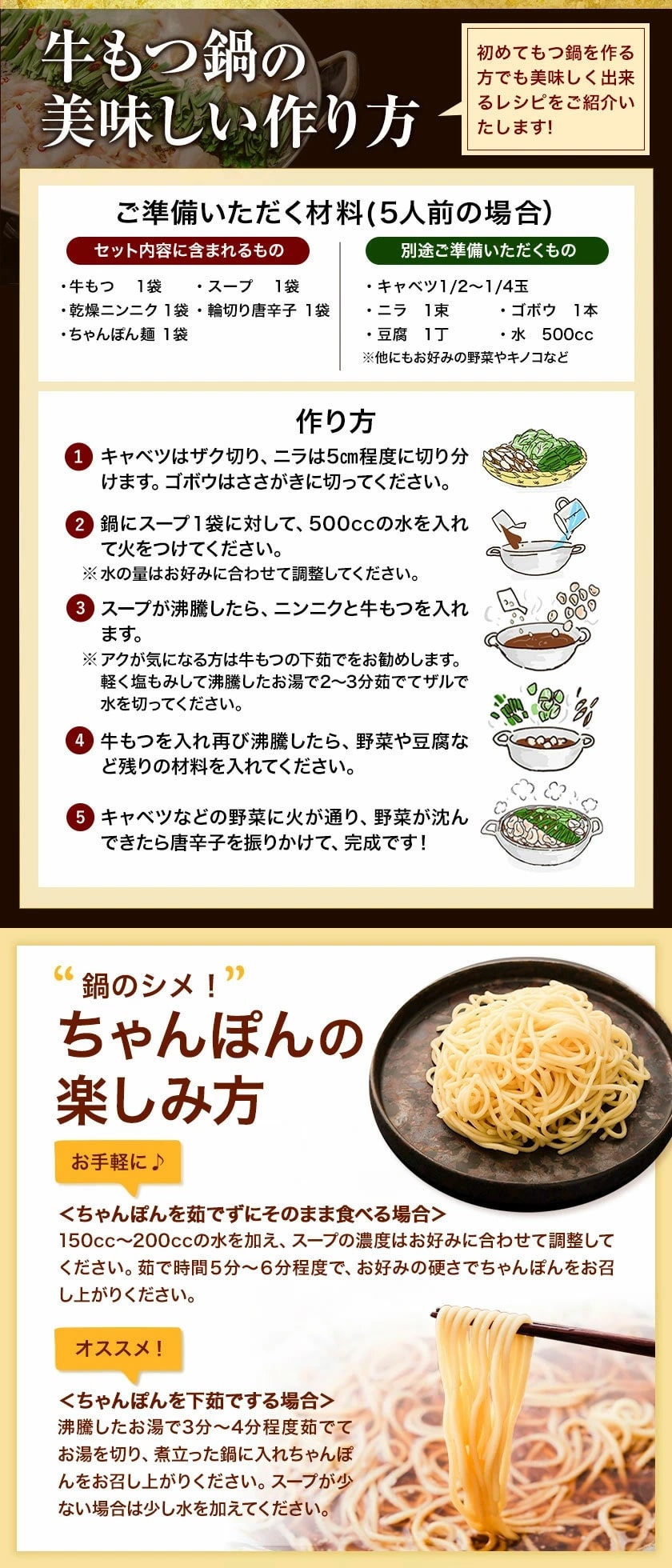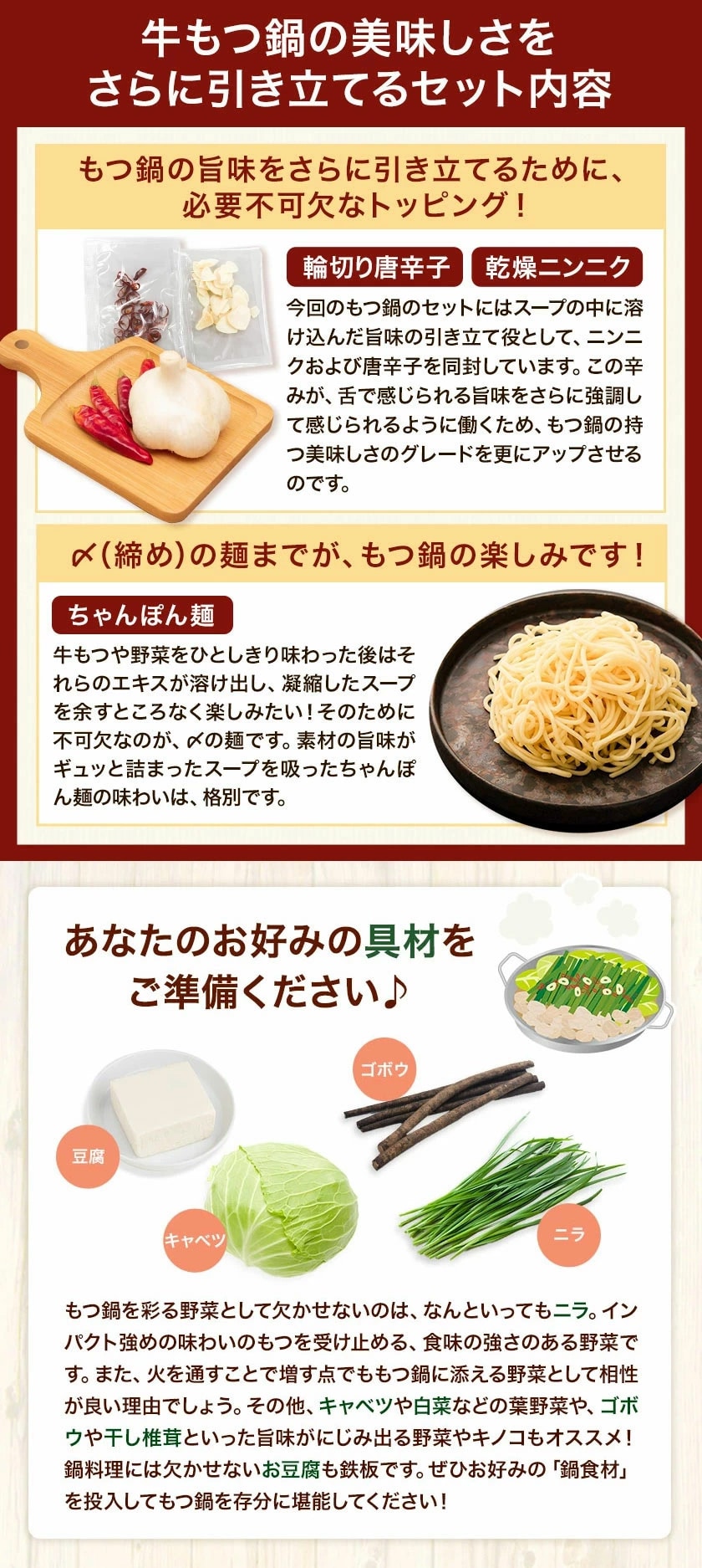 ■内容 モツ(国産牛小腸)500g×1袋 ちゃんぽん麺 90g×2袋 スープ 100ml×1袋 輪切り唐辛子 0.5g×1袋 乾燥ニンニク 3g×1袋