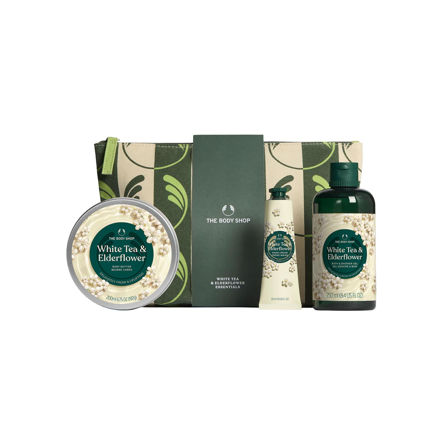 繊細なホワイトティーとエルダーフラワーが弾けるような高揚感あふれる香りの、バス&シャワージェル・ボディバター・ハンドクリームのボディケアギフト。