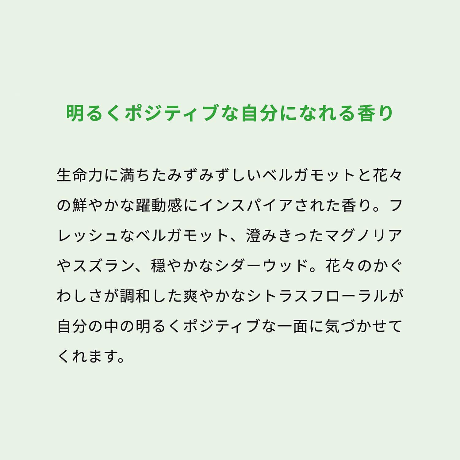 みずみずしいベルガモットをはじめ、マグノリア、スズランが奏でる鮮やかな躍動感ある香りが、軽やかでポジティブなエネルギーを刺激します。