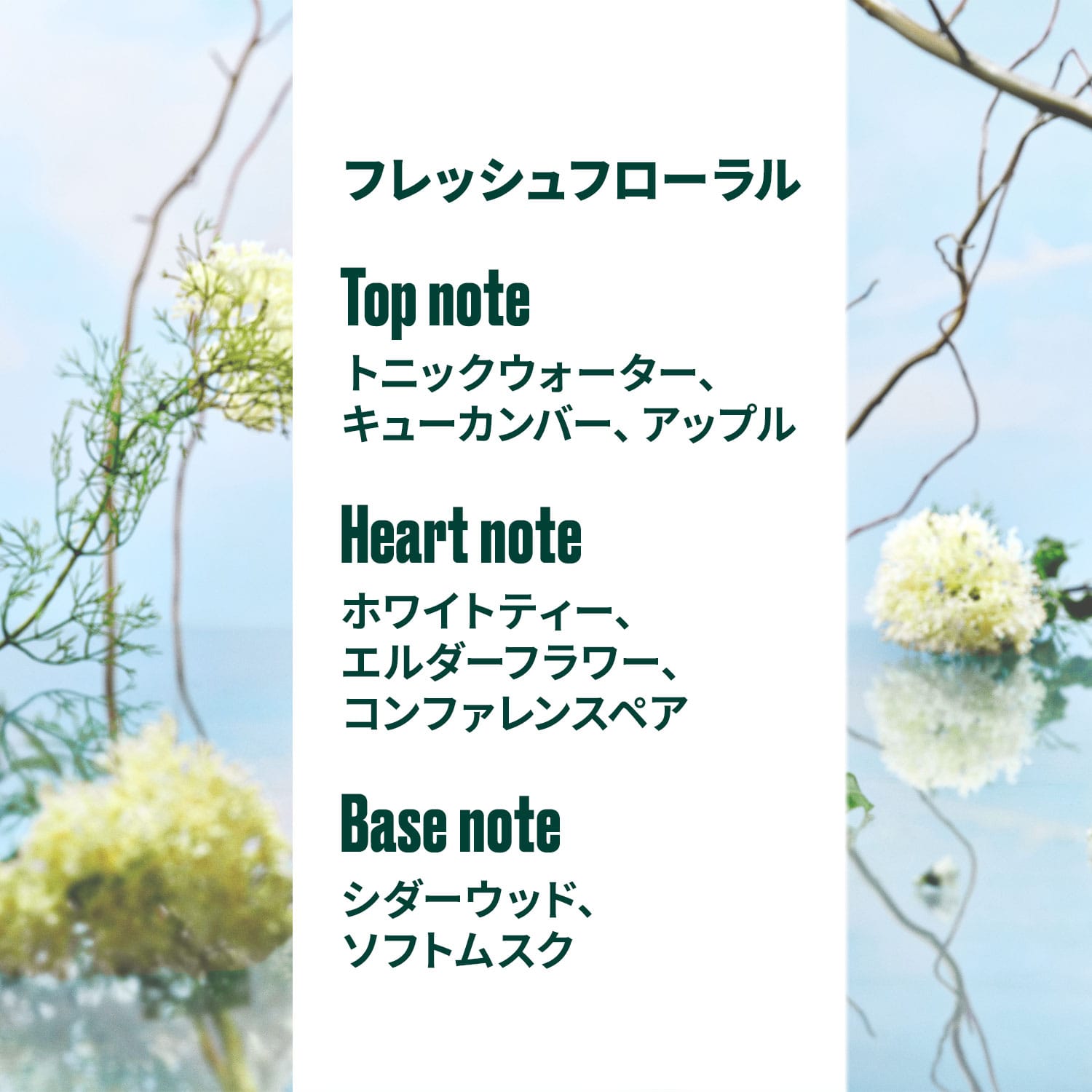 さわやかなトニックウォーター、キューカンバー、アップサイクルされたリンゴピューレが香りで始まり、ホワイトティー、エルダーフラワー、コンファレンスペアのハートへと流れ、静謐なシダーウッドと柔らかなムスクのベースで締めくくります。