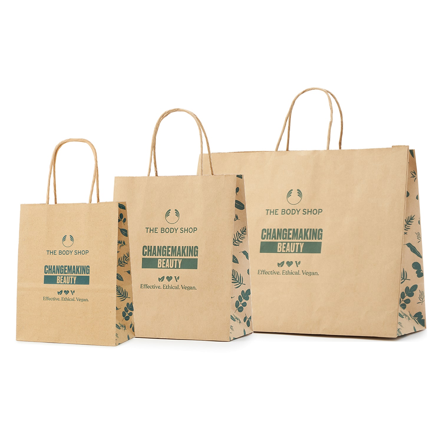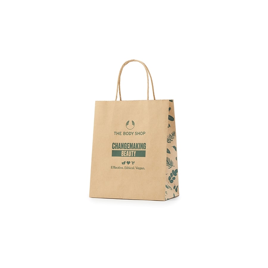 人、コミュニティ、地球環境に美しい変革を目指す、ザボディショップ「チェンジメイキングビューティ」のロゴがついた紙製ショッピングバッグ。