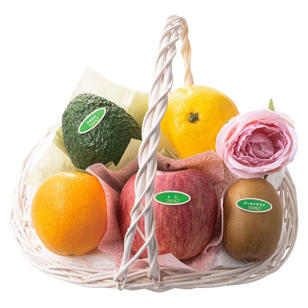 | 内容量 | ふじ(青森県産)、ニューサマーオレンジ(愛媛県産)またはニューサマーグリーン(静岡県産)または小夏(高知県産)、オレンジ(アメリカまたはエジプト産)、アボカド(メキシコ産)、サンゴールドキウイ(ニュージーランド産)、バラオーナメント×各1 |