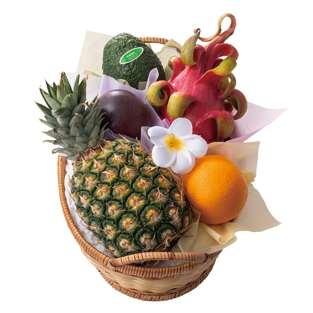 | 内容量 | パイナップル(フィリピン産)、ドラゴンフルーツ(ベトナム産)、パッションフルーツ(沖縄県または鹿児島県産)、オレンジ(アメリカまたはエジプト産)、アボカド(メキシコ産)、プルメリアオーナメント×各1 |