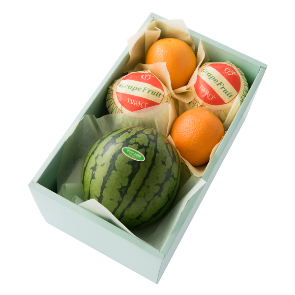 | 内容量 | ひとりじめ西瓜(熊本県または群馬県産)×1、グレープフルーツ(アメリカ、メキシコ、トルコまたは南アフリカ産)、オレンジ(アメリカまたはオーストラリア産)×各2 |