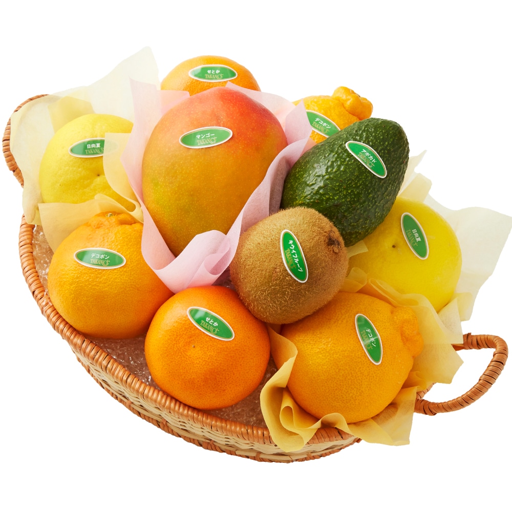 | 内容量 | デコポン(熊本県または佐賀県産)×3、日向夏(宮崎県産)、せとか(愛媛県または佐賀県産)×各2、マンゴー(ペルー、ブラジルまたはオーストラリア産)、アボカド(メキシコ産)、キウイフルーツ(ニュージーランド、愛媛県または和歌山県産)×各1(篭入) |