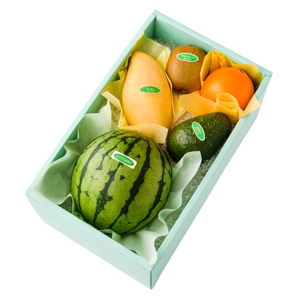 | 内容量 | ひとりじめ西瓜(熊本県または群馬県産)、タイマンゴー(タイ産)、アボカド(メキシコ産)、キウイフルーツまたはサンゴールドキウイフルーツ(ニュージーランド、愛媛県または和歌山県産)、オレンジ(アメリカまたはオーストラリア産)×各1 |