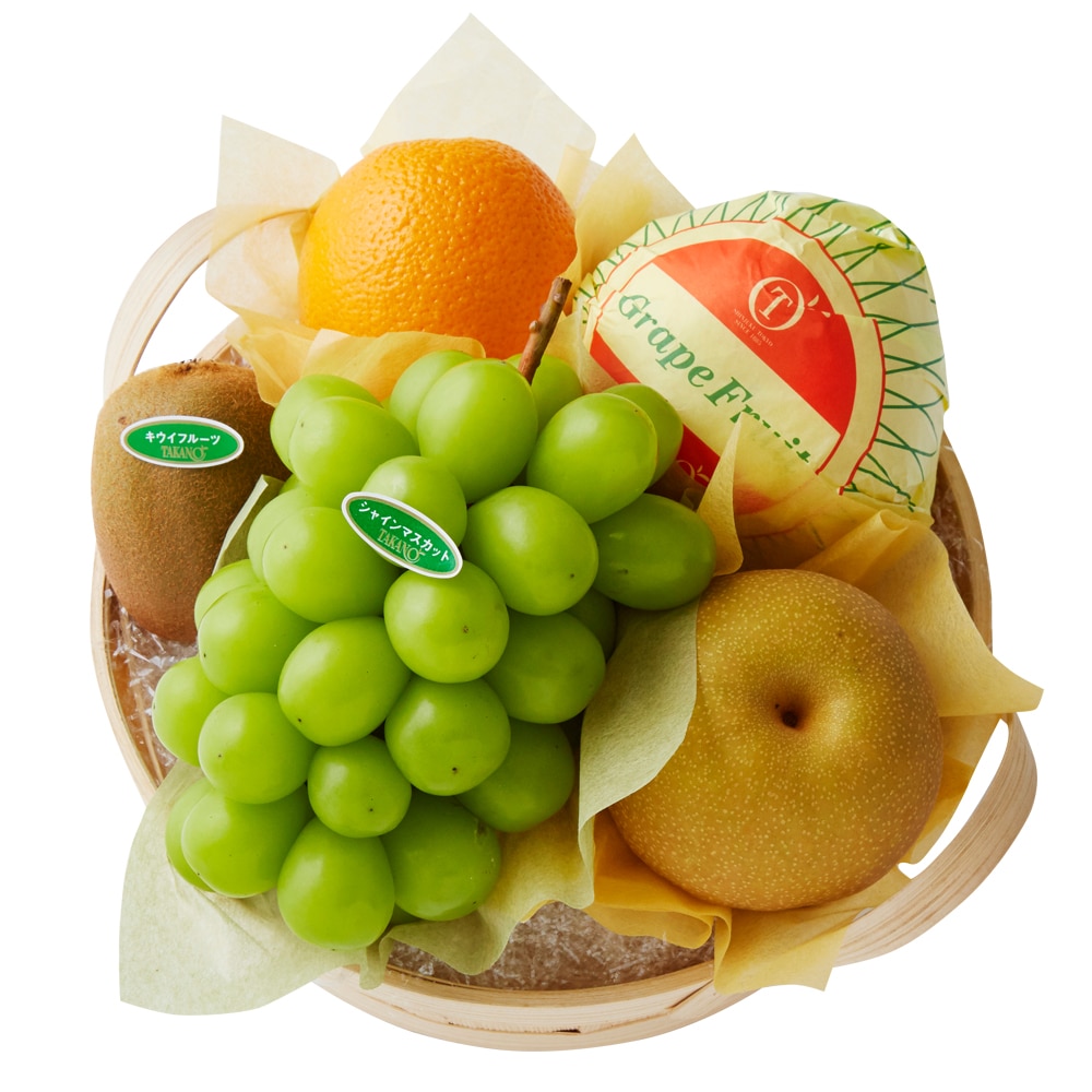 | 内容量 | シャインマスカット(山梨県、長野県または香川県産)、和梨(千葉県、佐賀県、福岡県または茨城県産)、キウイフルーツ(ニュージーランド産)、オレンジ(アメリカまたはオーストラリア産)、グレープフルーツ(南アフリカまたはアメリカ産)×各1(篭入) |