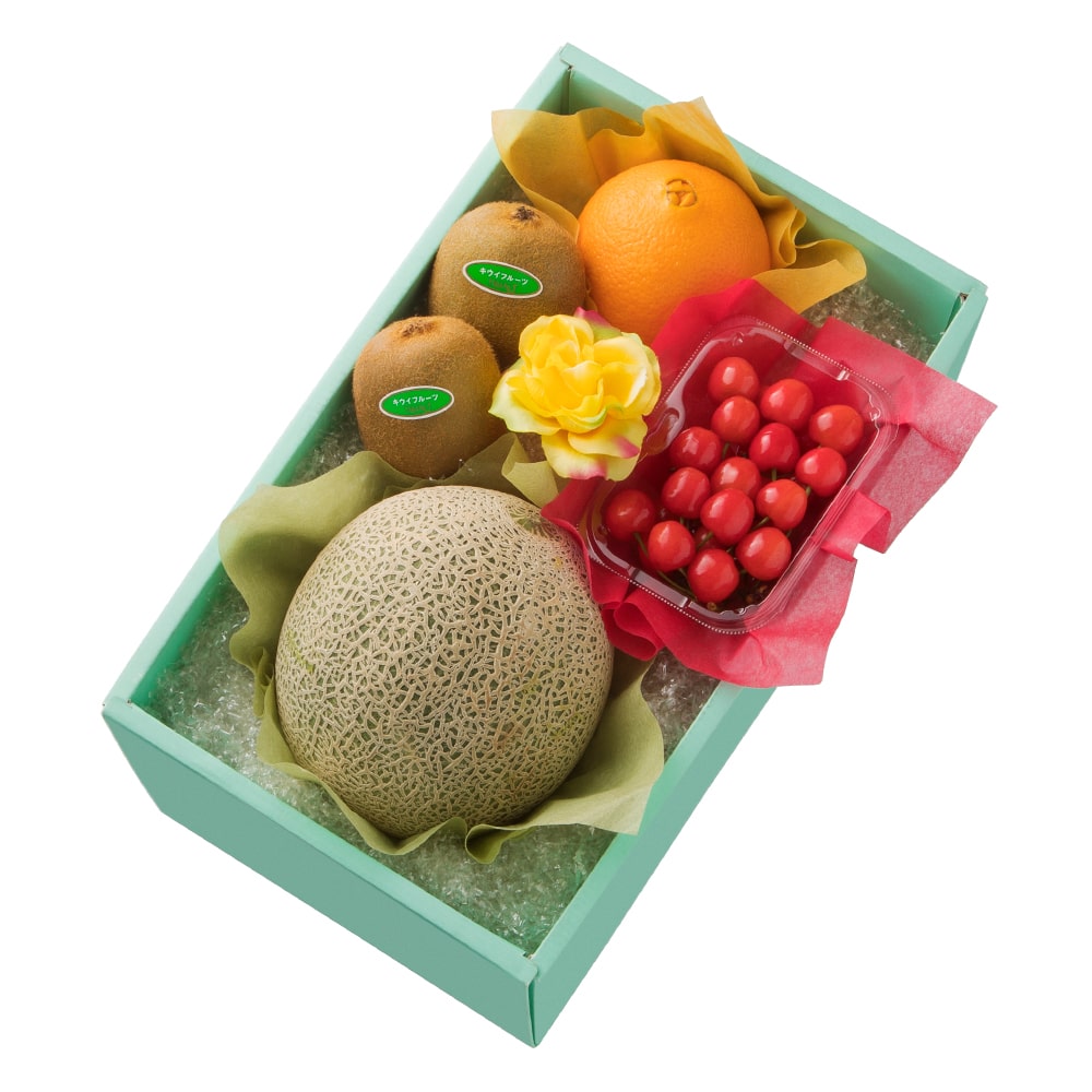 | 内容量 | メロン(千葉県、茨城県または山形県産)、さくらんぼ約100g入(山形県、長野県、山梨県または青森県産)、オレンジ(アメリカ、オーストラリア、南アフリカまたはトルコ産)×各1、キウイフルーツ(ニュージーランド産)×2、バラ(造花)×1 |