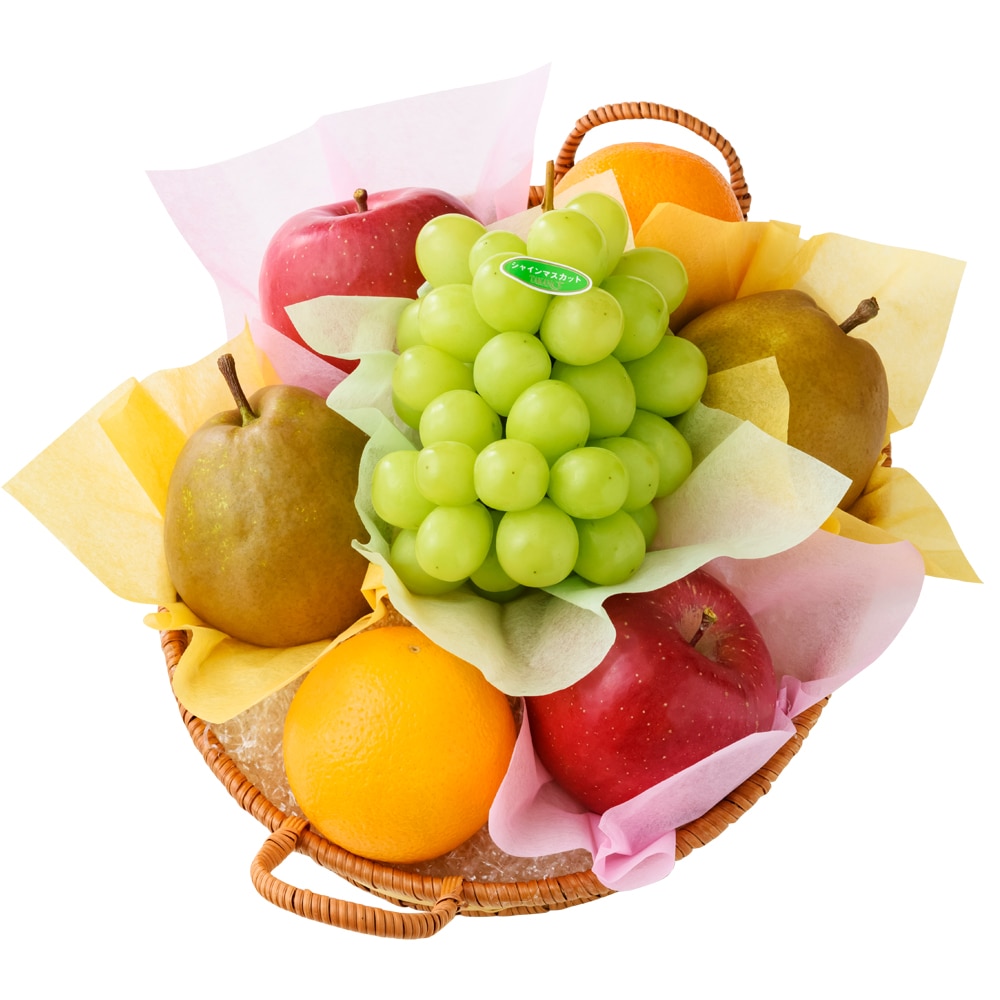 | 内容量 | シャインマスカット 約600g前後(長野県または山梨県産)×1、洋梨(山形県、長野県、青森県または宮城県産)、りんご(山形県、長野県、秋田県、青森県または岩手県産)、オレンジ(アメリカまたはオーストラリア産)×各2(篭入) |