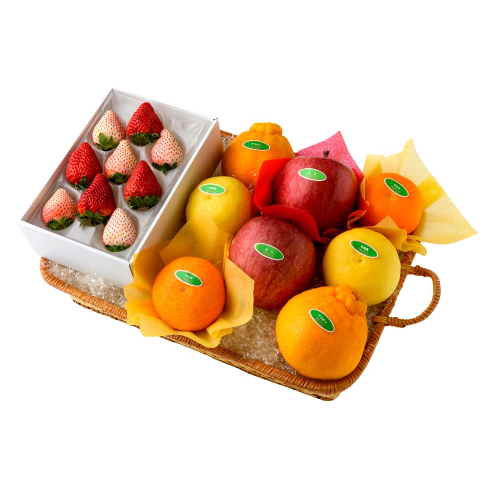 | 内容量 | 初恋の香り5粒(静岡県、和歌山県または山口県産)、アイベリー4粒(千葉県産)×各1、デコポン(熊本県または佐賀県産)、せとか(愛媛県または佐賀県産)、日向夏(宮崎県産)、ふじ(青森県または長野県産)×各2(篭入) |