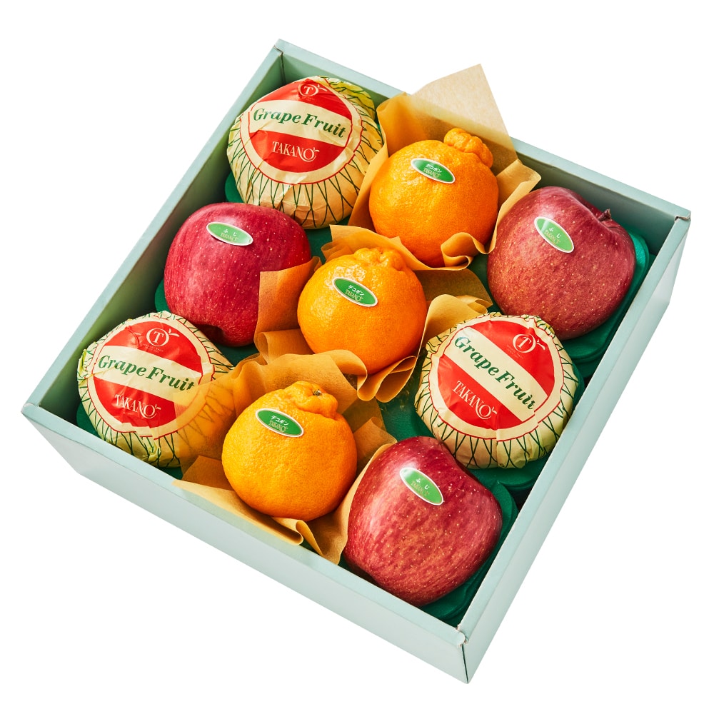 | 内容量 | デコポン(熊本県または佐賀県産)、ふじ(青森県、山形県、長野県または岩手県産)、グレープフルーツ(アメリカ、メキシコまたはオーストラリア産)×各3 |