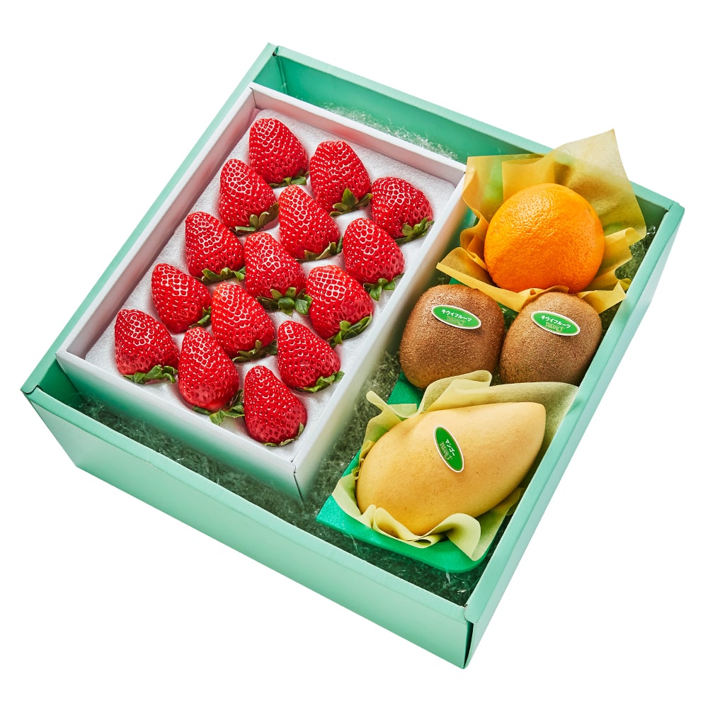 | 内容量 | まりひめいちご15粒(和歌山県産)、タイマンゴー(タイ産)、オレンジ(アメリカまたはオーストラリア産)×各1、キウイフルーツ(ニュージーランド、愛媛県または和歌山県産)×2 |