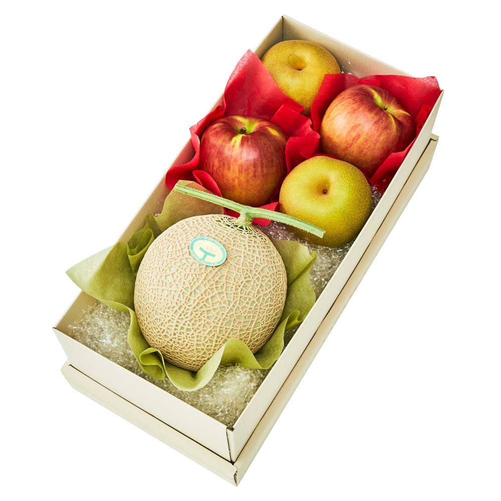 | 内容量 | マスクメロン(静岡県産)×1、和梨(千葉県、茨城県、栃木県または長野県産)、りんご(青森県、山形県、長野県または岩手県産)×各2 |