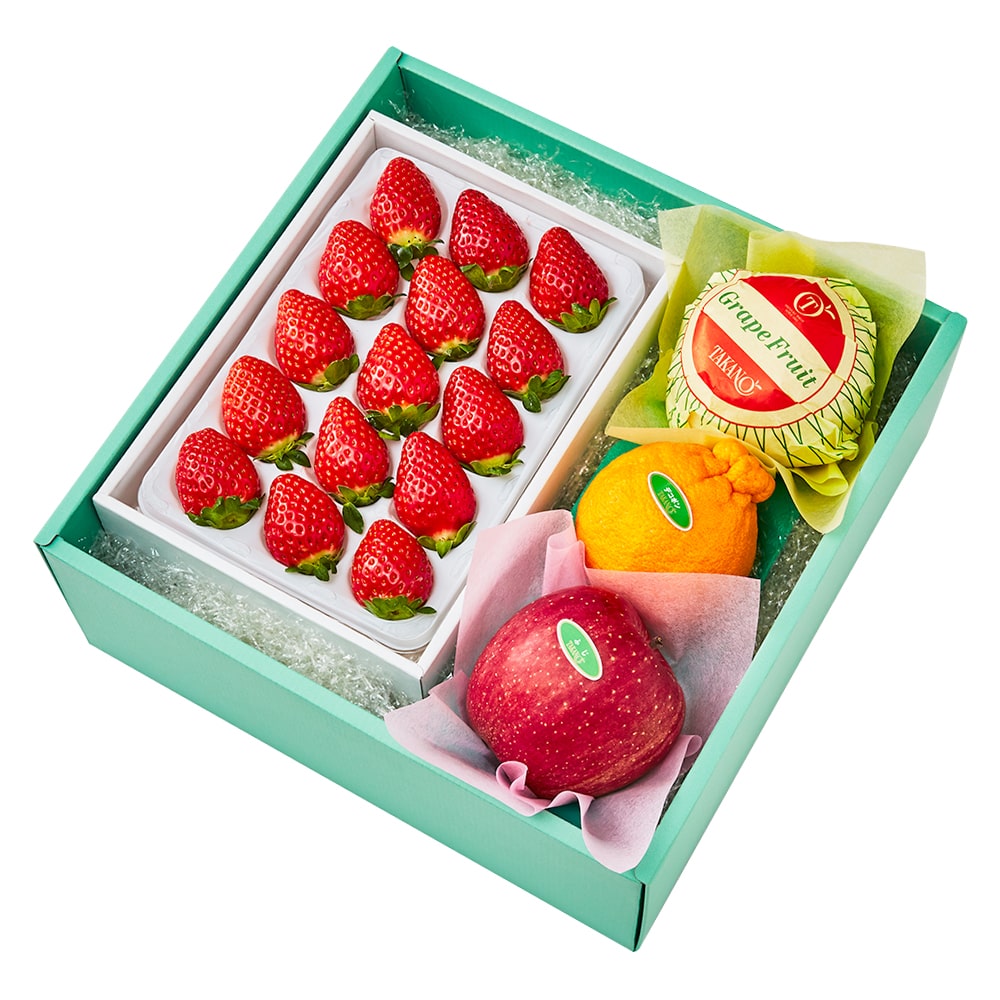 | 内容量 | まりひめいちご15粒(和歌山県産)、デコポン(佐賀県または熊本県産)、りんご(青森県または長野県産)、グレープフルーツ(アメリカ、メキシコまたはオーストラリア産)×各1 |