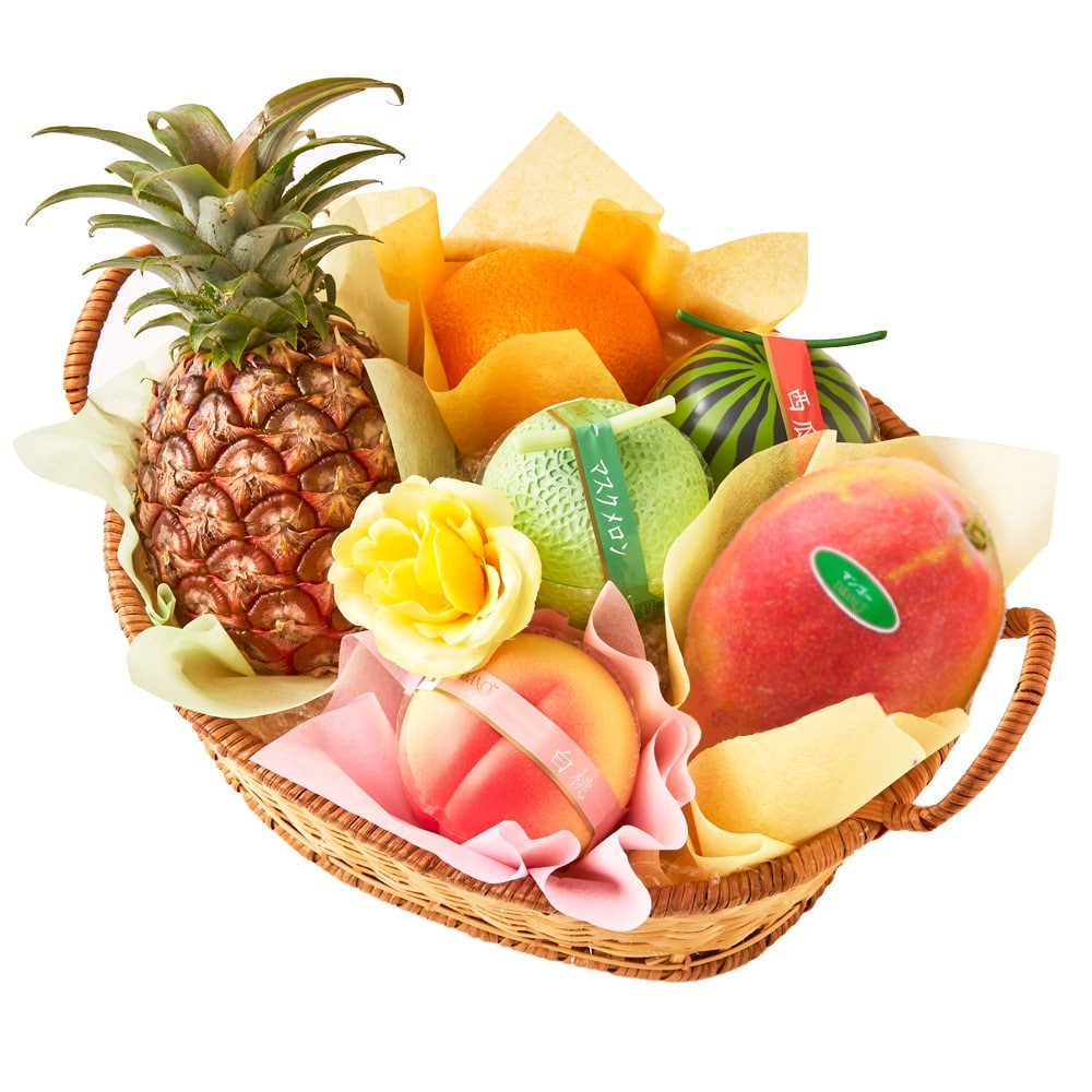 | 内容量 | マンゴー(ペルーまたはメキシコ産)、ミニパイン(沖縄県産)、オレンジ(アメリカ、オーストラリア、南アフリカまたはトルコ産)×各1、果実ピュアゼリー(マスクメロン、西瓜、白桃×各1)、バラ(造花)×1(篭入) |