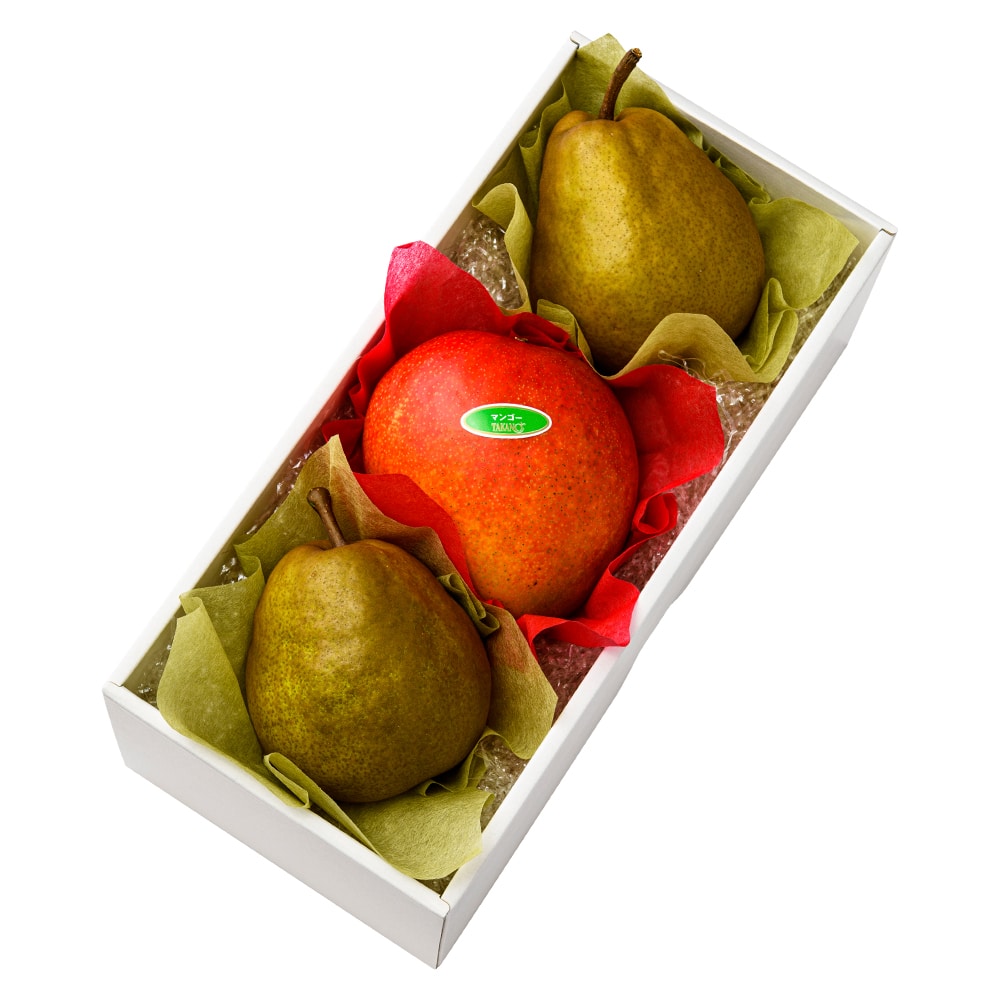 | 内容量 | マンゴー(ブラジル、ペルーまたはオーストラリア産)×1、洋梨(長野県、山形県、秋田県または青森県産)×2 |