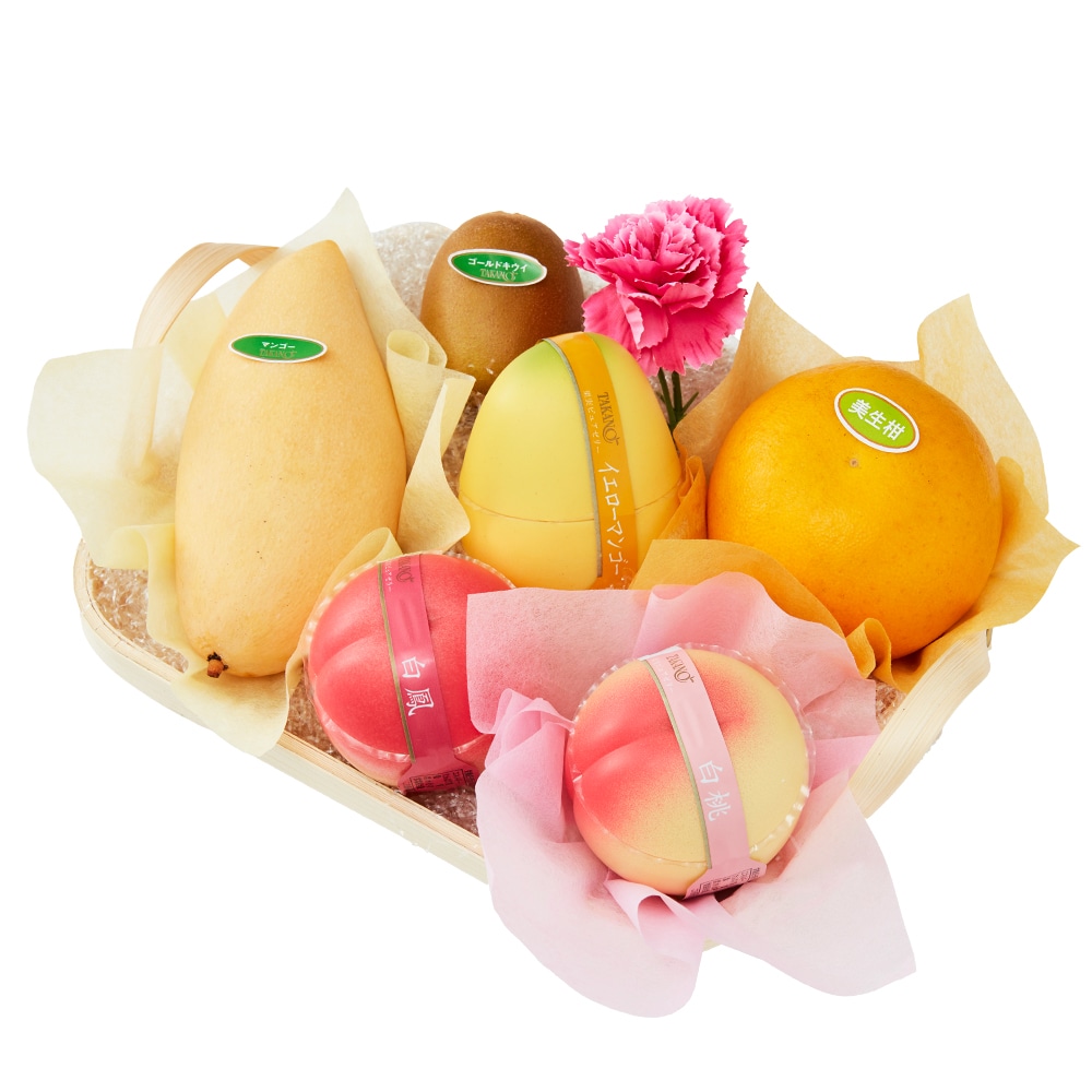 | 内容量 | マンゴー(タイ産)、美生柑(愛媛県または熊本県産)、サンゴールドキウイ(ニュージーランド産)×各1、果実ピュアゼリー(イエローマンゴー、白桃、白鳳×各1)、カーネーション(造花)×1(篭入) |