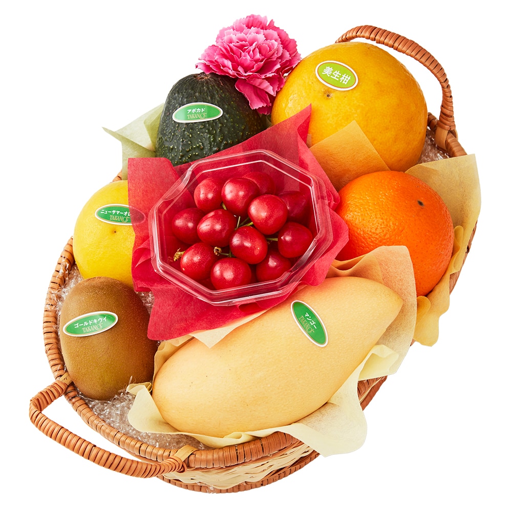 | 内容量 | さくらんぼ約100g入パック(山形県、長野県または山梨県産)、美生柑(愛媛県または熊本県産)、ニューサマーオレンジ(愛媛県産)またはニューサマーグリーン(静岡県産)または小夏(高知県産)、マンゴー(タイ産)、オレンジ(アメリカまたはエジプト産)、アボカド(メキシコ産)、サンゴールドキウイ(ニュージーランド産)、カーネーション(造花)×各1(篭入) |