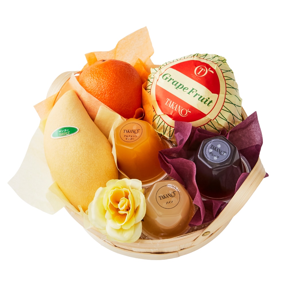 | 内容量 | マンゴー(タイ産)、グレープフルーツ(アメリカ、南アフリカまたはトルコ産)、オレンジ(アメリカ、オーストラリア、南アフリカまたはトルコ産)×各1、果実ゼリー(グレープ、パイン、アルフォンソマンゴー×各1)、バラ(造花)×1(篭入)*タイマンゴーには数種類の品種ある為、出荷時に品質、食味等の良い物をお詰めいたします。その為、画像と形状や色見等が異なる場合があります。 |