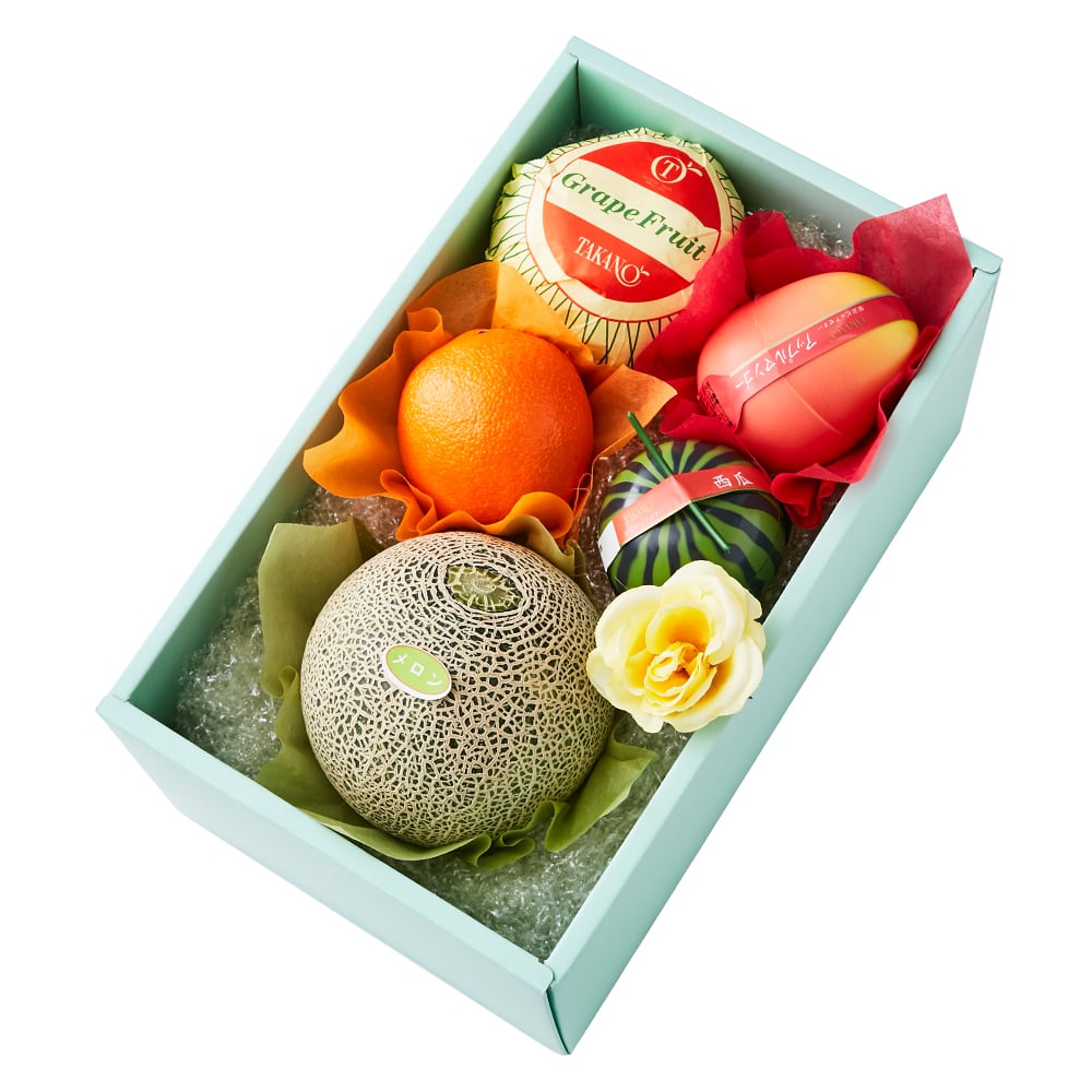 | 内容量 | メロン(千葉県、熊本県、茨城県または山形県産)、オレンジ(アメリカ、オーストラリア、南アフリカまたはトルコ産)、グレープフルーツ(アメリカ、南アフリカまたはトルコ産)×各1、果実ピュアゼリー(アップルマンゴー、西瓜×各1)、バラ(造花)×1 |