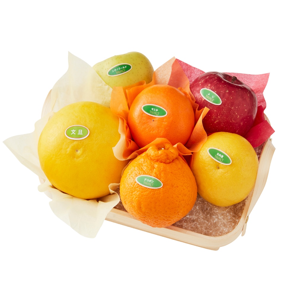 | 内容量 | 文旦(高知県産)、デコポン(熊本県または佐賀県産)、せとか(愛媛県または佐賀県産)、日向夏(宮崎県産)、ふじ(青森県または長野県産)、シナノゴールド(青森県または長野県産)×各1(篭入) |